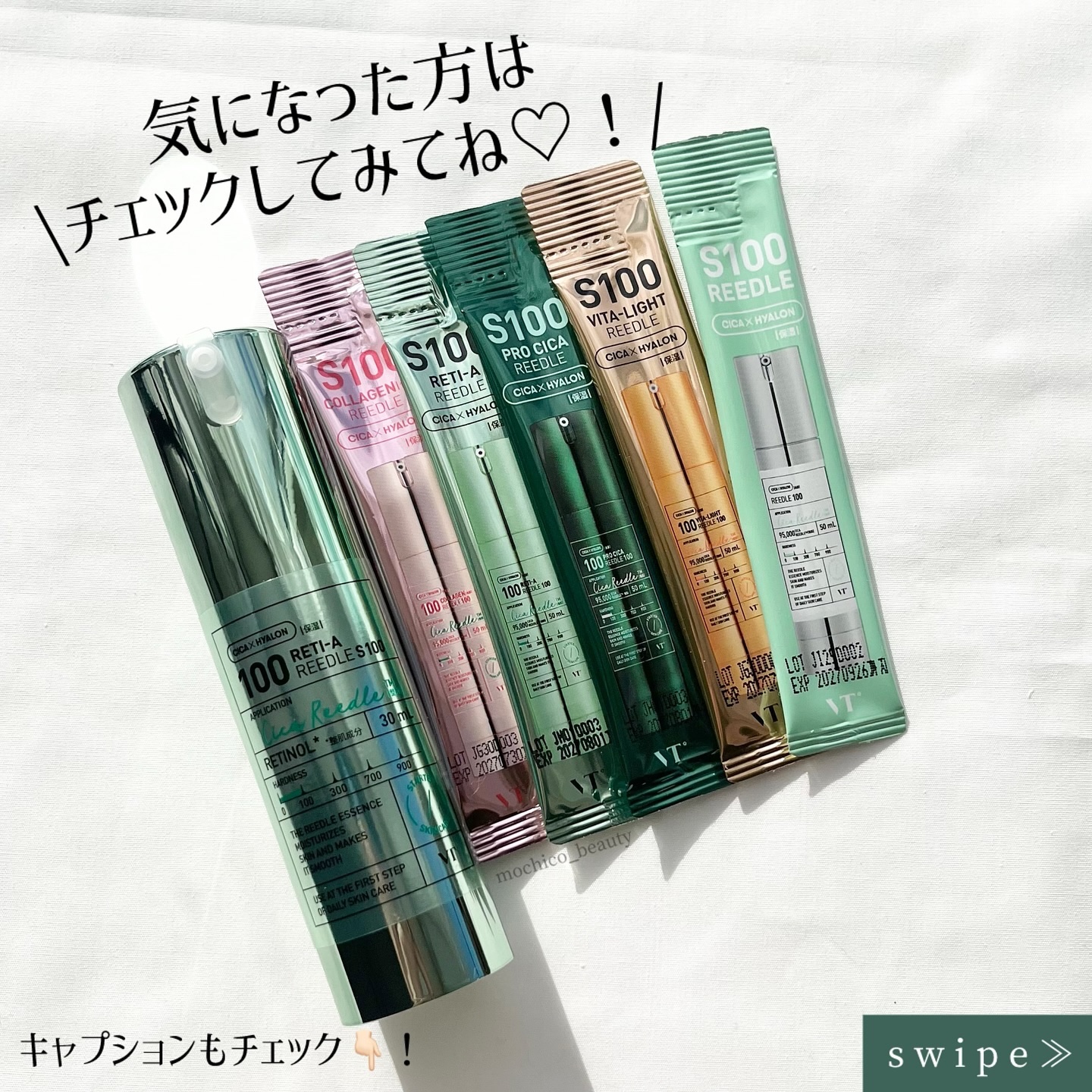 - <S100 レチAリードル> 水、DPG、グリセリン、ナイアシンアミド、BG、マカデミア種子油、1,2-ヘキサンジオール、パルミチン酸エチルヘキシル、ポリアクリル酸Na、(アクリル酸Na/アクリロイルジメチルタウリンNa)コポリマー、ステアリン酸グリセリル、ステアリン酸ポリグリセリル-6、ウコン根エキス、ポリイソブテン、グリセレス-26、シリカ、エチルヘキシルグリセリン、カプリリルグリコール、キサンタンガム、アデノシン、メリアアザジラクタ花エキス、(カプリリル/カプリル)グルコシド、オレイン酸ソルビタン、ベヘン酸ポリグリセリル-6、メリアアザジラクタ葉エキス、ヒアルロン酸Na、メリアアザジラクタ樹皮エキス、サンゴモエキス、カミメボウキ葉エキス、ワサビノキ種子油、ツボクサエキス、バクチオール、ジメチルイソソルバイド、ヒマワリ種子油、β-カロチン、レチノイン酸ヒドロキシピナコロン、レシチン、ポリソルベート20、レチノール、プロポリスエキス、カキ葉エキス、ブドウ果実エキス、アラビアコーヒーノキ種子エキス、ベニバナ花エキス、イタドリ根エキス、アシアチコシド、クリ殻エキス、チャ葉エキス、サンショウ果実エキス、マデカッソシド、マデカシン酸、アシアチン酸