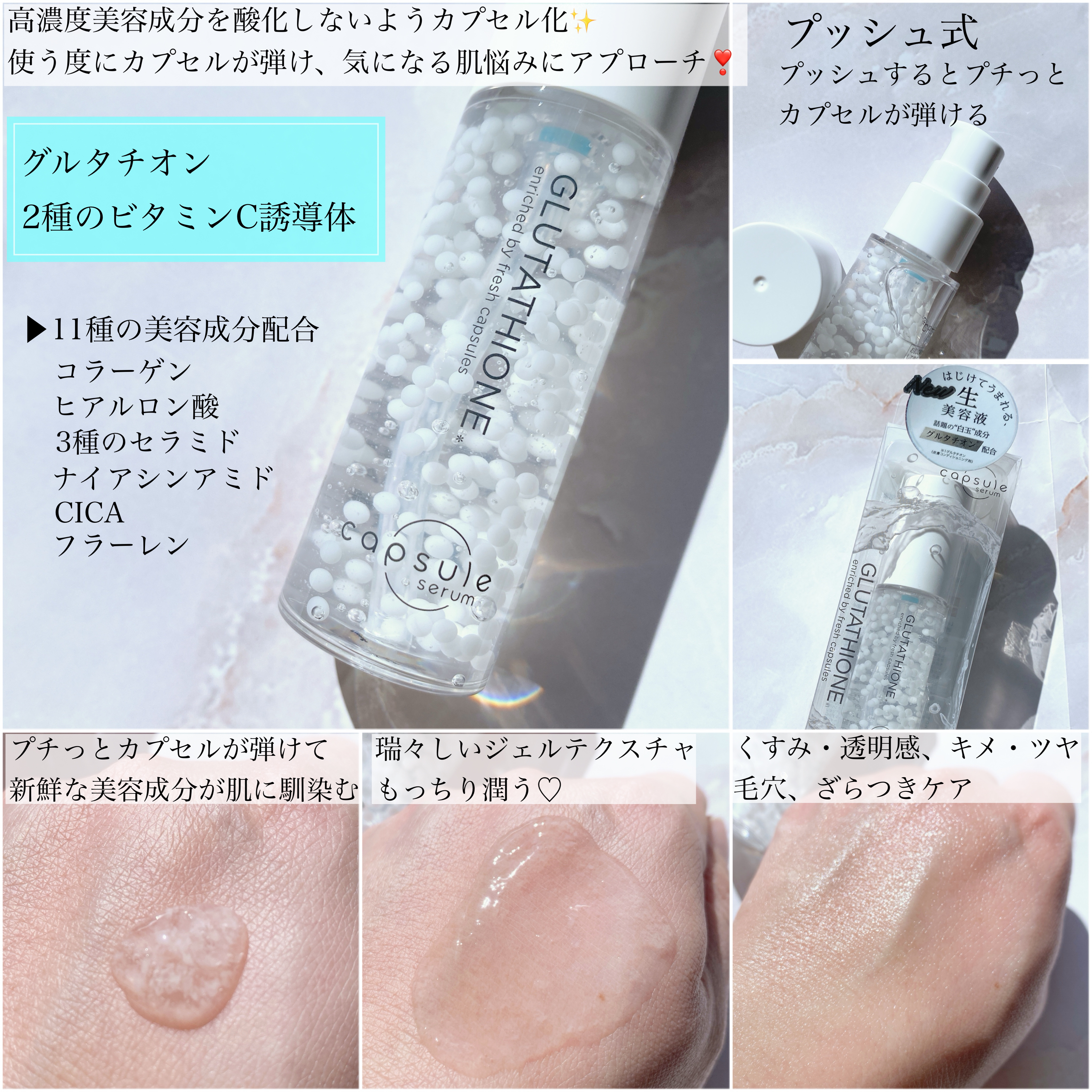 - ①はじける白玉!注目の"グルタチオン"*1をカプセルに厳選配合 ②新鮮なグルタチオンが肌に浸透*2 ③グルタチオン×2種のビタミンC誘導体*3が総合的にアプローチ ④コラーゲン、ヒアルロン酸、3種類のセラミド、ナイアシンアミド、ツボクサエキス(CICA)、フラーレン等11種類の整肌成分を同時に配合 ⑤肌なじみのよい使い心地 ⑤毛穴*4、ざらつき*5、くすみ*5・透明感5、キメ・ツヤもコレ1つで。4in1美容液。 はじけて生まれる生美容液。-独自カプセルが、成分本来のチカラをサポートするこだわりの美容液- *1グルタチオン(皮膚コンディショニング剤) *2角質層まで *3パルミチン酸アスコルビルリン酸3Na、3-グリセリルアスコルビン酸(酸化防止剤) *4乾燥による毛穴の開き *5乾燥による