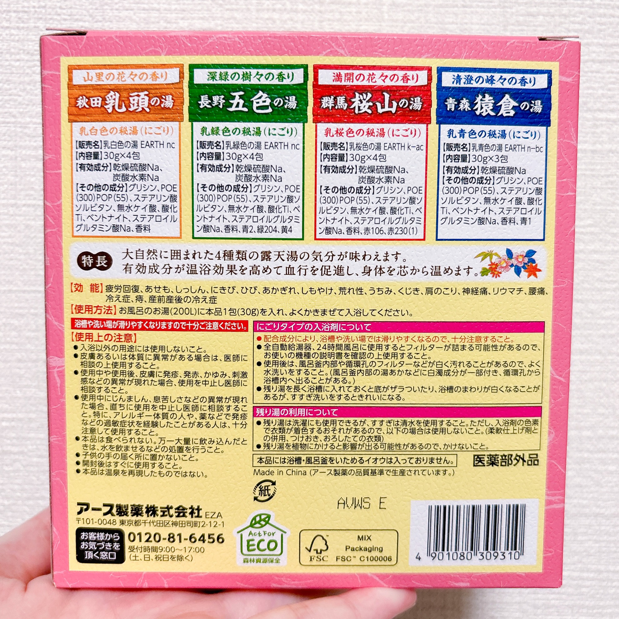 各地の温泉気分を楽しめるアソートタイプの入浴剤。秋田・長野・群馬・青森の有名露天湯を参考にして作り上げたそうです! 🔴群馬桜山の湯 満開の花々の香り 乳桜色(にごり) なかなか旅行に行けないけどお風呂で旅行気分を楽しめてハマってます!!
