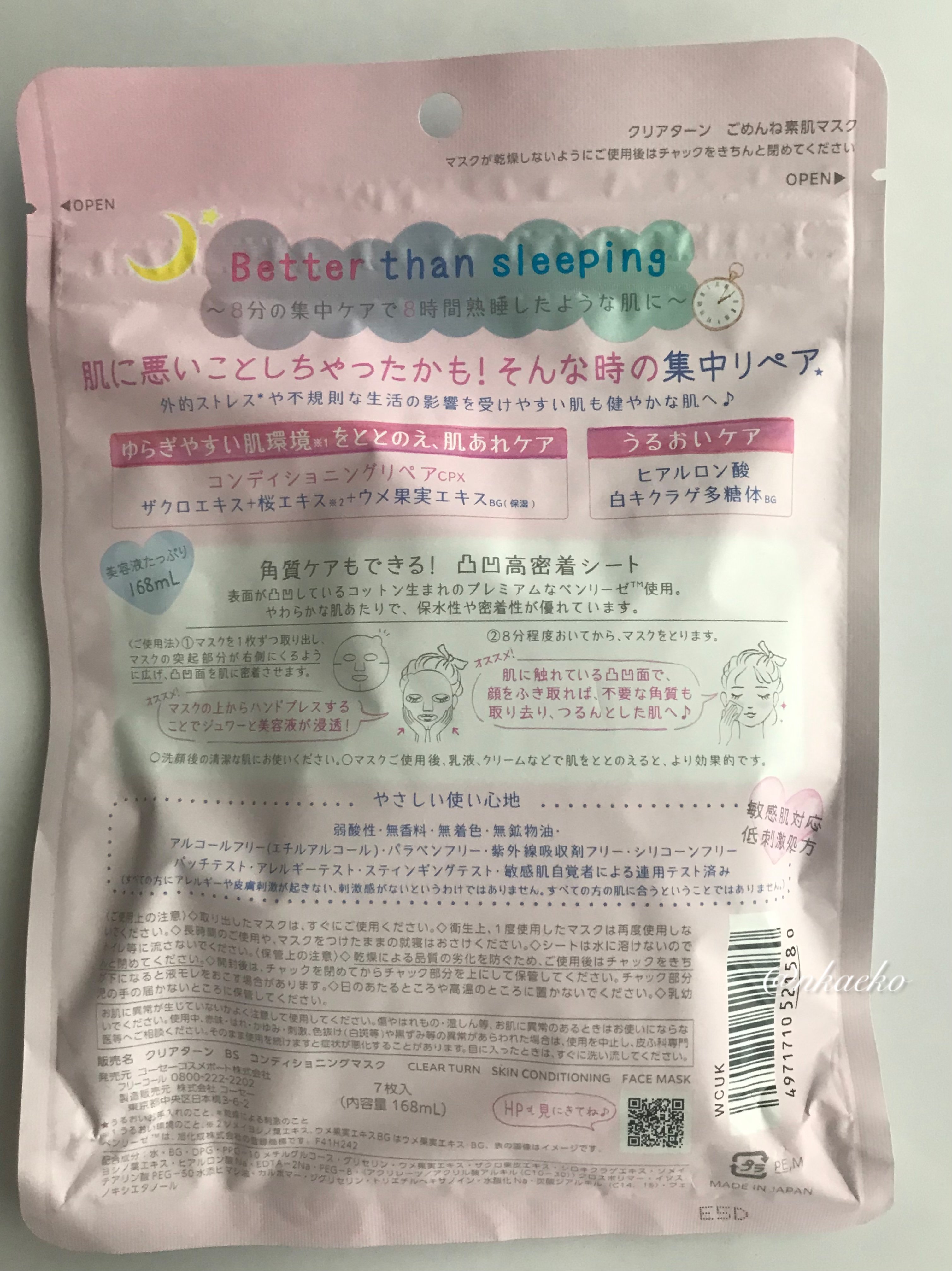 - 【クリアターン ごめんね素肌マスク】 負担をかけて、あれてしまった肌の素肌環境※1をととのえる“速攻集中リペア※2マスク”です。 ① あれがちな肌を素早くコンディションケア! ザクロエキス、桜エキス※3、ウメ果実エキスBG配合し、ゆらぎやすい肌環境をととのえ、肌あれをケアします。また、うるおいケア成分として、ヒアルロン酸、白キクラゲ多糖体BGを配合。外的ストレス※4や不規則な生活の影響を受けやすい肌も健やかでゆらぎにくい肌へみちびきます。 ②敏感肌も使える、弱酸性・低刺激処方 無香料・無着色・無鉱物油・アルコールフリー(エチルアルコール)・パラベンフリー・紫外線吸収剤フリー・シリコーンフリー・パッチテスト済み・アレルギーテスト済み・スティンギングテスト済み・敏感肌自覚者による連用テスト済み(すべての方にアレルギーや皮膚刺激が起きない、刺激感がないというわけではありません。すべての方の肌に合うということではありません。) ③角質ケアもできる!凸凹高密着シート コットン生まれのやわらかな肌触りのベンリーゼを使用。 表面に凸凹のエンボス加工を施しているため、密着性が高く、はがしたマスクでやさしく顔をふきとることで角質ケアもできます。 ※1 うるおい環境のこと ※2 うるおいお手入れのこと ※3 ソメイヨシノ葉エキス、ウメ果実エキスBGはウメ果実エキス・BG(保湿) ※4 乾燥による刺激のこと