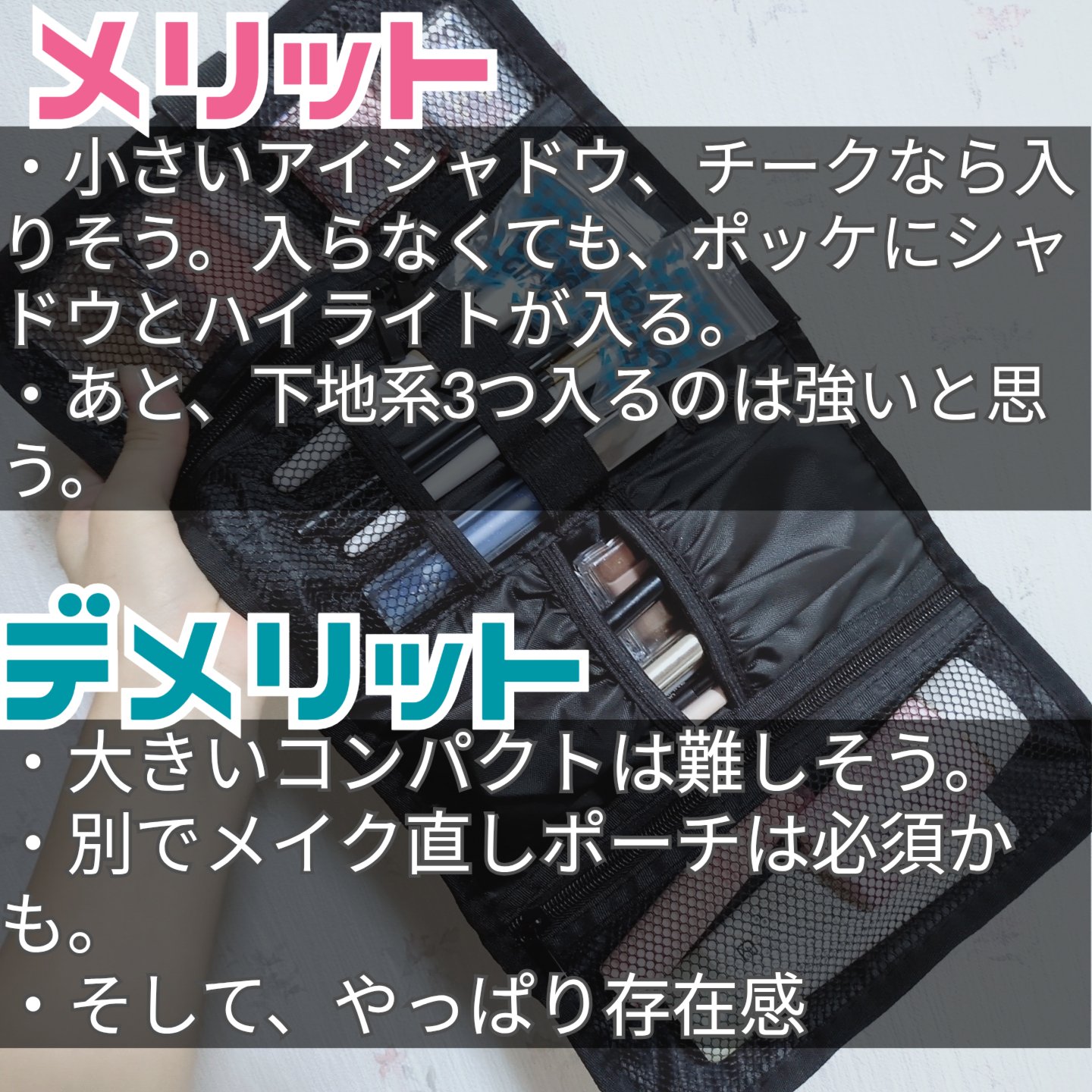 小ポケット、大ポケット、すぐに取り出せるポケット、ブラシが入る場所と大容量です! 1泊分のお泊まりメイクはまとめられるかもしれない!アイシャドウ、チーク、ハイライト、シャドウも入りました! 大ポケット下地まで入るのは最強だと思いました。