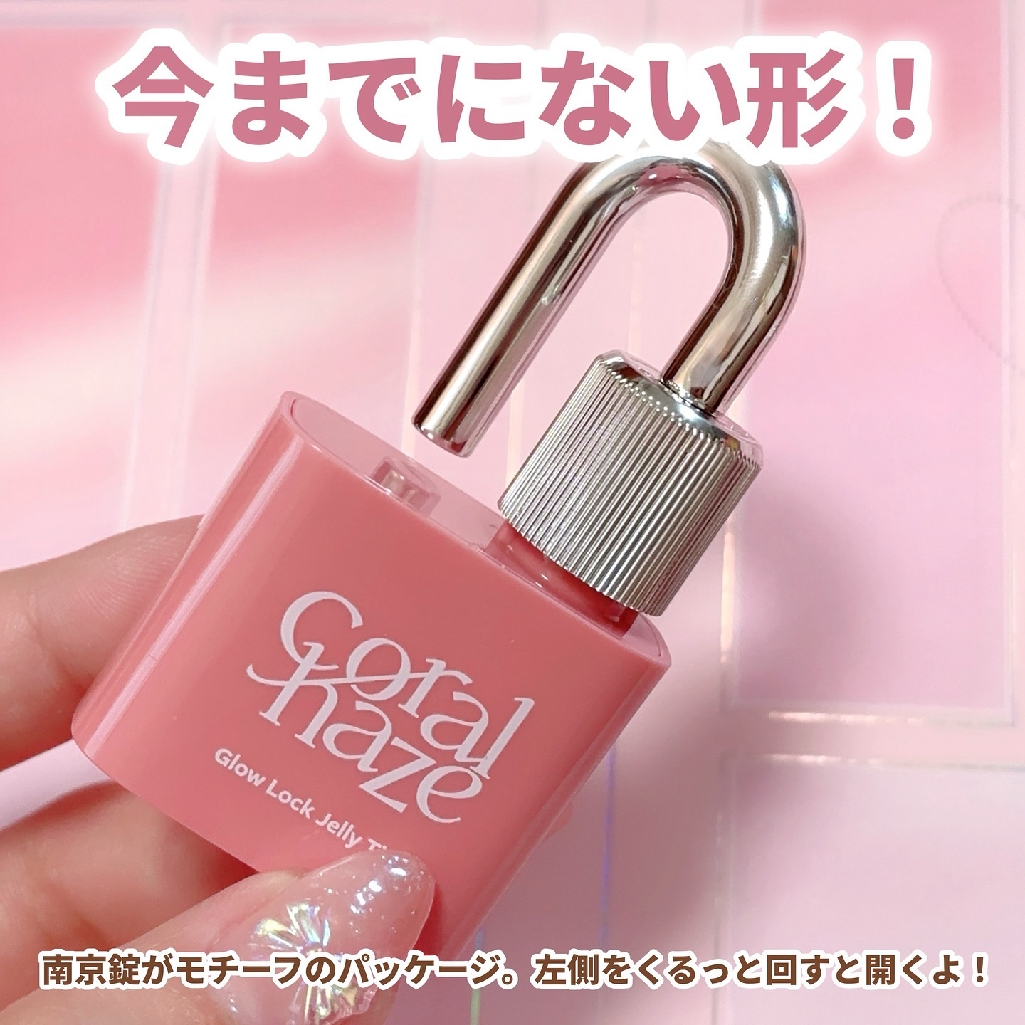 パケが南京錠みたいなリップ🔒✨ こんな形初めて見る👀🩷 ポーチやバッグに付けたくなる可愛さ🔒🩷 ツヤ感あるティントで塗り重ねる程にツヤ感が増すのが特徴💋✨ 個人的にツヤ感があるから赤やブラウンなどの重たくなりがちなカラーも使いやすいのがいいと思った💄✨
