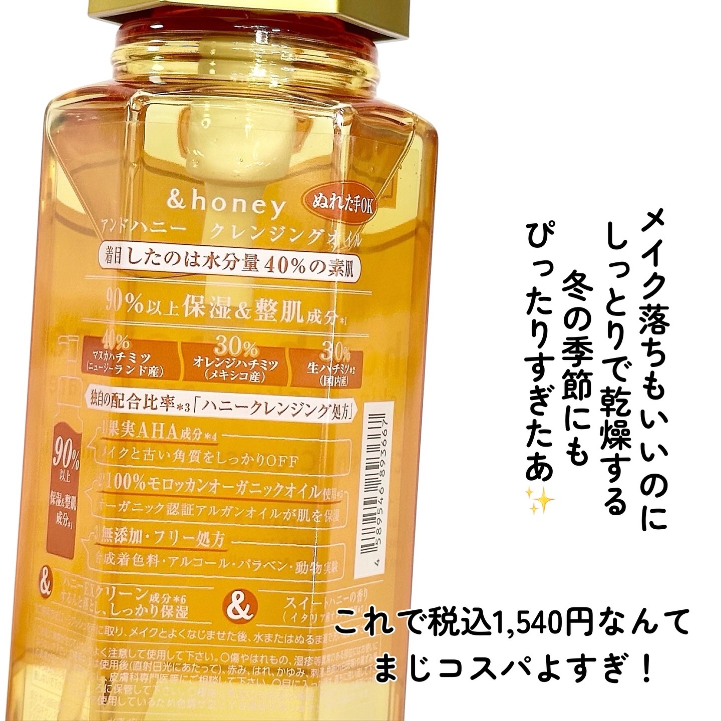 クレンジング界の隠れ名品✨とも言われてるクレンジングオイルを使ってみたよ🐝🌼 とろとろのテクスチャーでメイクも摩擦レスでオフ出来ちゃうよ✨ ハチミツ美容🍯💛 製品の90%以上を☑︎ハチミツ*1 ☑︎オルガンオイル*2 ☑︎オーガニックヒアルロン酸*3 などの保湿&整肌成分で構成されてるの🫧