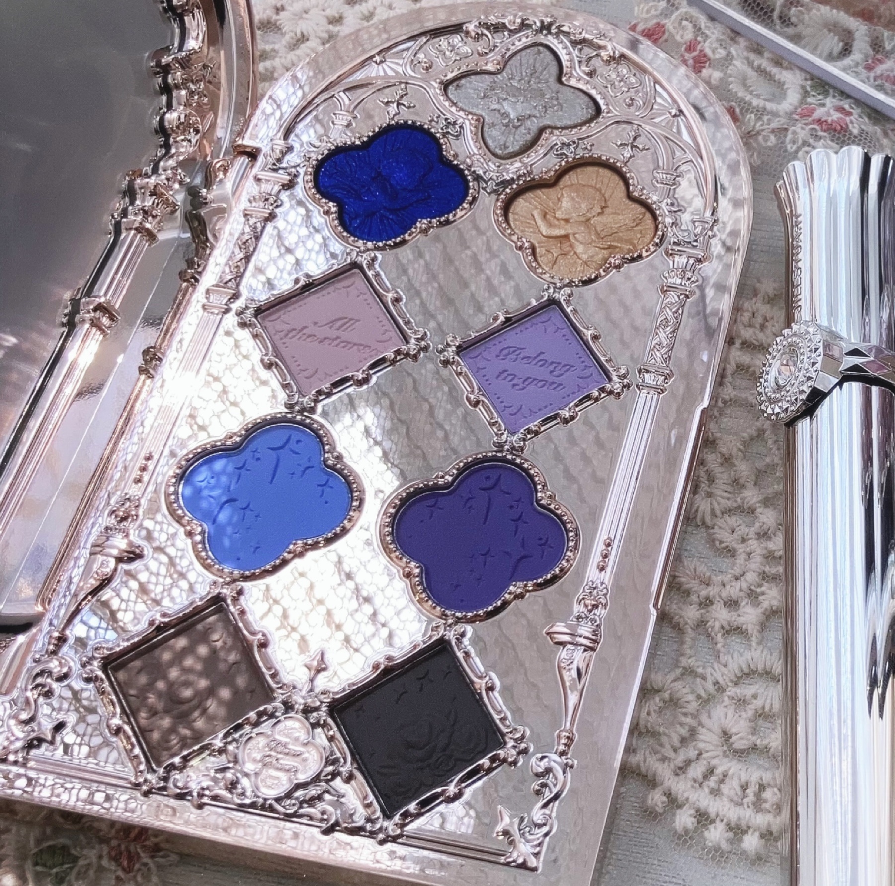 - 中世ゴシック建築をモチーフにしたパレット。 神聖な教会をイメージし厳かな雰囲気に。 6色のマットカラーと3色のパールカラーで様々なメイクアイデアに挑戦できるパレットになっています。 シルクサテンのような繊細なパールカラーは、ダイナミックでシックな目元に。 マットなパウダーは繊細で肌なじみがよく、自由自在に発色をコントロールできます。 どちらも持ちがよく、とても伸びるので使いやすさ◎ ◆01 Eden's Angel (伊甸天使) 聖母マリアの涙×天使(ホワイト) [デイリー]低彩度のブラウンカラーは日常メイクにぴったり。 あたたかな天使のようなメイクを演出します。 [特別な日]聖母マリアが零す慈愛に満ちた涙をイメージしたメイクがおすすめ。 泣きはらしたように上品に赤く染まる目元を表現。 きっとだれもがあなたに注目してしまいます。 ◆02 Weeping Angel(哭泣天使) 聖母マリアの涙×天使(ブラック) [特別な日]ゴシックなブラックマリアメイク。 聖母マリアの涙をイメージしたゴールドが、ジュエルブルーのカラーによく映えます。 ベースメイクはクールにし、アイメイクを主役にするのがおすすめ。 [堕天使メイク]ブルーにブラウンを使い、濃いめのチークをいれたクールだがどこかあどけなさが残るインパクトのあるメイク。 ■注意 外傷・炎症などのある箇所には使用しないでください。使用中に異常が生じた場合直ちに使用を中止し、医師に相談されることをおすすめします。