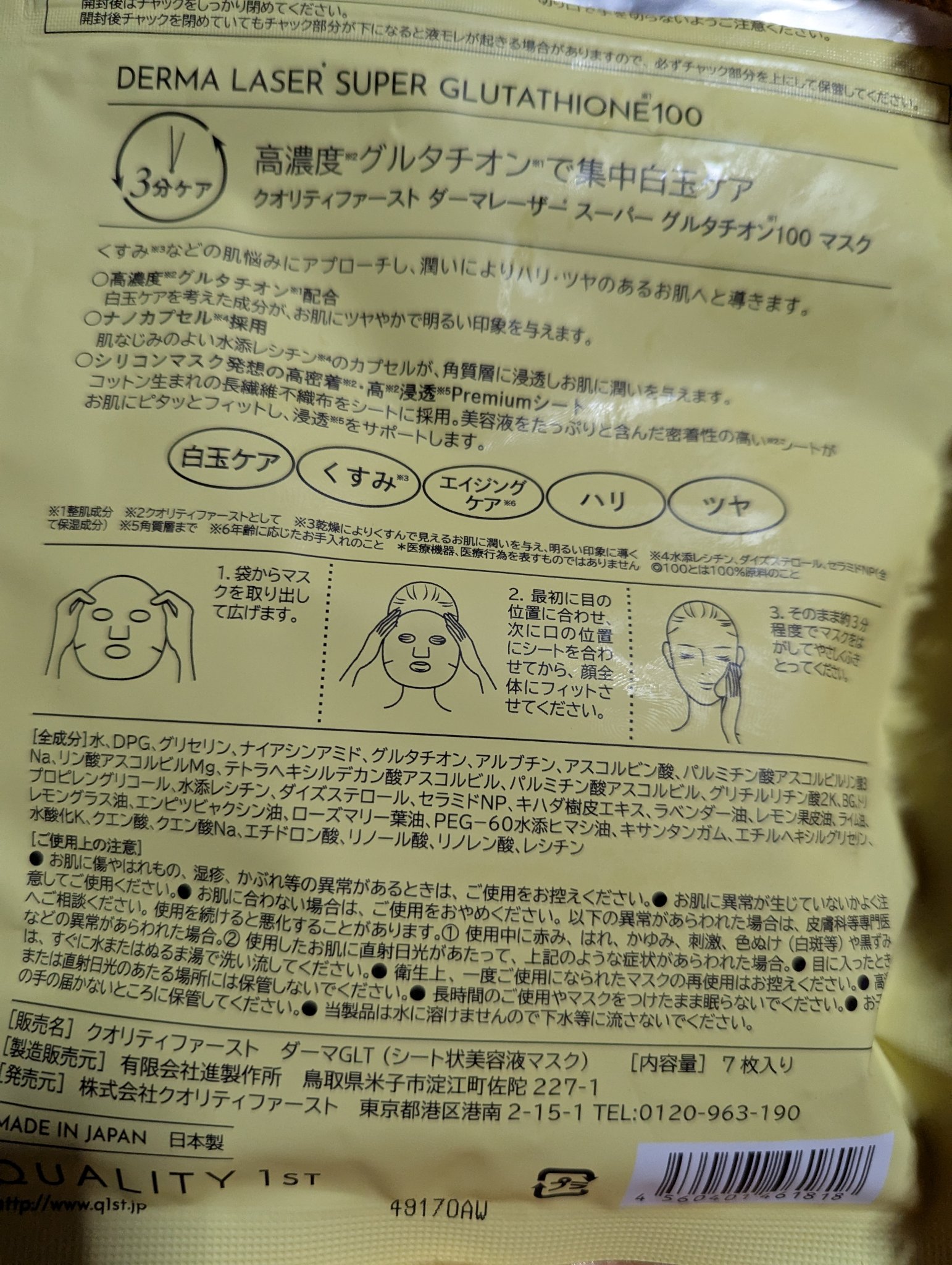 クオリティファーストのダーマレーザー スーパー グルタチオン100 マスクを見つけたので、購入してみました。 さすがクオリティファースト、美容液はびっくりするくらいヒタヒタ。 7枚使い切ってもまだたっぷり入っているので、美容液として使っています笑