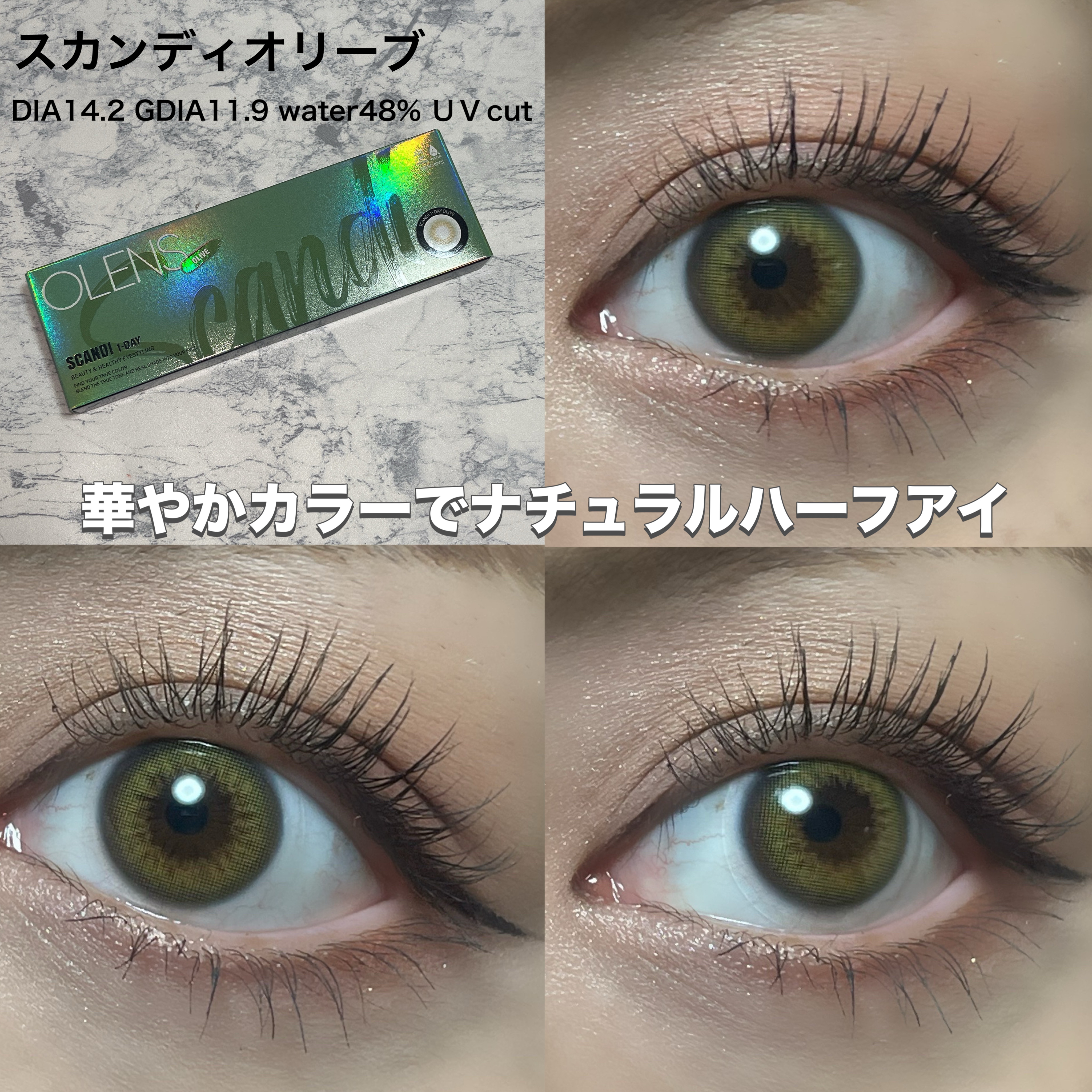 このオリーブはコスプレ感もなく使えて、浮かずに馴染むから可愛いよーー🍀 やっぱりGlowyが1番すき。 裸眼風に溶け込み神秘的な印象しっかりオリーブ感だしたいならこれ。