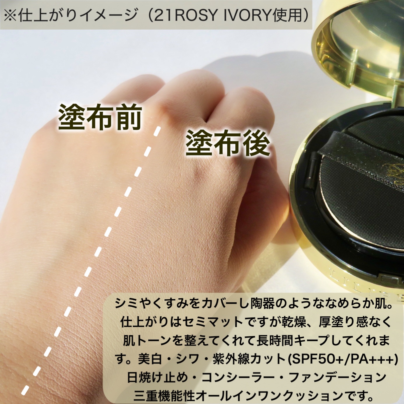 - 超密着フィッティングフォーミュラの無欠点クッションとして掲げている、「30時間クッション」という別称で、シミをカバーし、長時間使用しても肌がくすみにくく、30時間きれいな肌を演出してくれます。 また、完璧なカバー力と肌のキメを整えることができ、上品なツヤ感を表現することも可能です。 密着力に優れており、ご使用いただいた方からは「本来の肌がもともと綺麗なように見せてくれる」「どの角度からでもなめらかな肌を演出してくれシルク肌になれる」という感想を多くいただきました。 【使用方法】 1.パフに適量を取り、肌を静かに叩くようにして密着させます。 2.カバーが必要な箇所にはもう一度行います。 使用後、必ずカバーを閉じてください。カバーを開けたままにしておくと、成分などが蒸発し、内容物が収縮する場合があります。