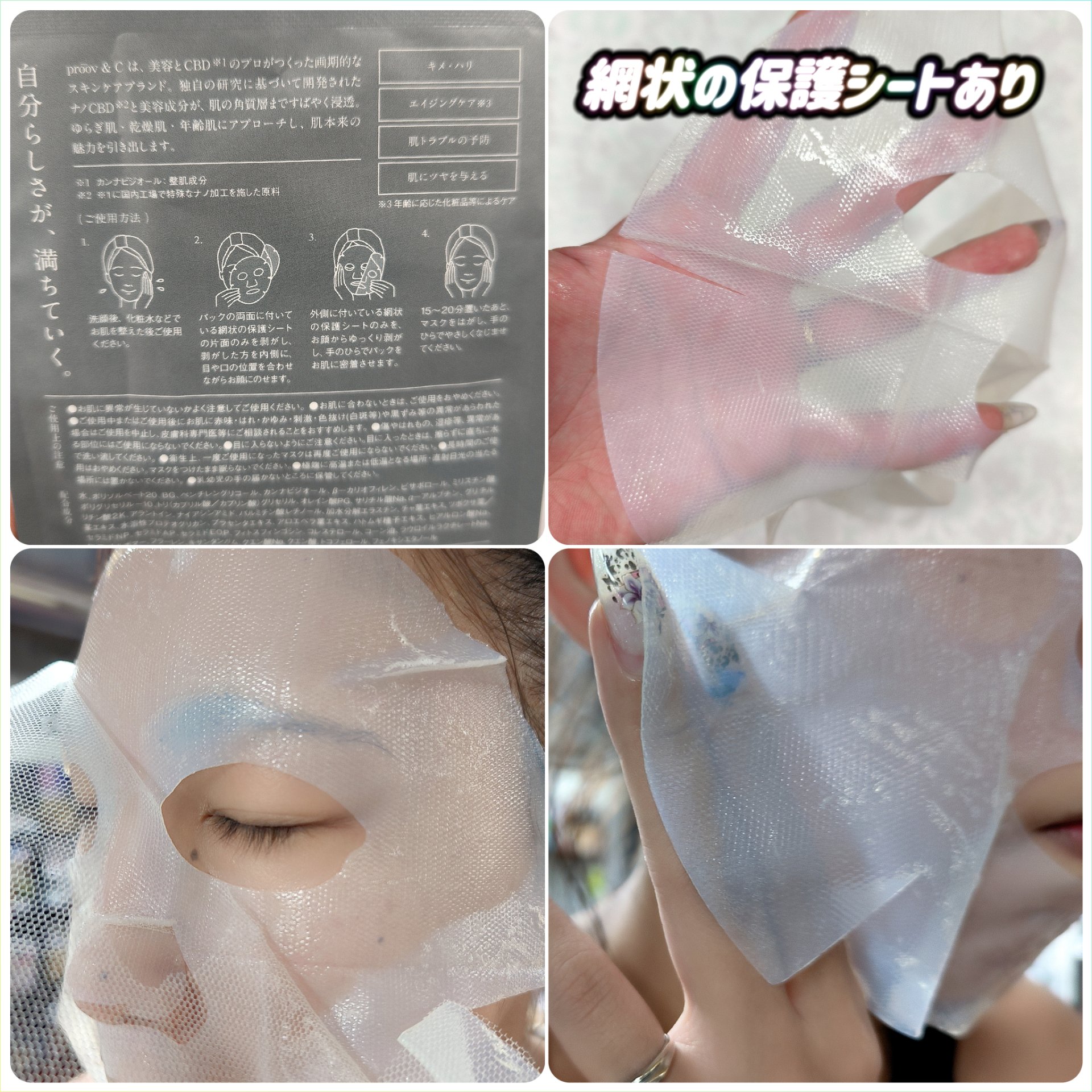 - proov&Cのプレミアム フェイスパックは、独自の特殊技術を用いたナノCBD*1配合フェイスパックです。 こだわりの技術と天然由来の成分を組み合わせた、独自の次世代スキンケア体験を提供します。 1週間に1度のスペシャルケアとしてお使いいただけます。うるおい・ハリツヤのある肌へ。 ■独自の特殊技術「非水製剤式」でナノCBD*1を高配合 水を使わずに特殊技術を使い、高濃度ナノCBD*1の配合を可能にしました。 ■高い保湿作用!「バイオセルロース」を採用 フェイスパックにバイオセルロース(天然の微生物によって生成される極細繊維)を採用することで、肌にぴったりと密着し、美容保湿成分をスムーズに浸透*2させます。1袋に30mLと多量の美容液をほとんど残らずに1回で使用できます。 ■美容保湿成分をたっぷり配合 「CICA*3」「ヒト型セラミド」「ヒアルロン酸」などの保湿成分をたっぷり配合し、肌にうるおいを浸透*2させます。また整肌成分「ナイアシンアミド」「レチノール」「プラセンタエキス」で肌にハリツヤを与えます。 ■天然由来成分配合 厳選された天然由来の植物エキスやミネラル成分が豊富に含まれています。これらの成分は、肌の油水分バランスを補い、自然な美しさをサポートします。敏感肌にも使えて、毎日のスキンケアに使用できます。 *1BIO SUISSEの認証を取得したスイス生産者および、U.S.Hemp Authorityの認証を取得している米国生産者と提携し、日本の法律に準拠したCBD(カンナビジオール)等カンナビノイド原料(保湿)のみを使用しています。 *2角質層まで *3ツボクサ葉/茎エキス ※THC(テトラヒドロカンナビノール)は含まれていません。