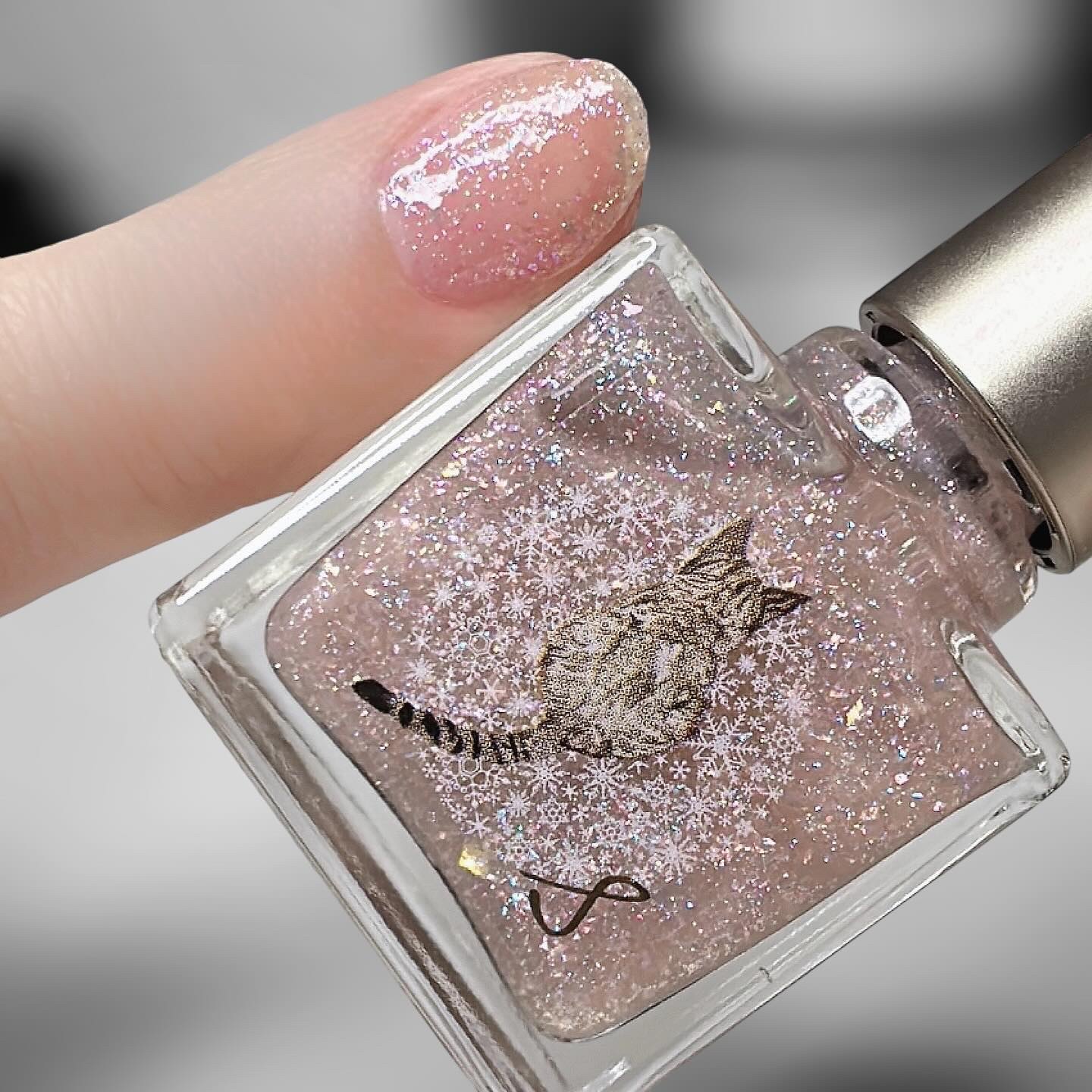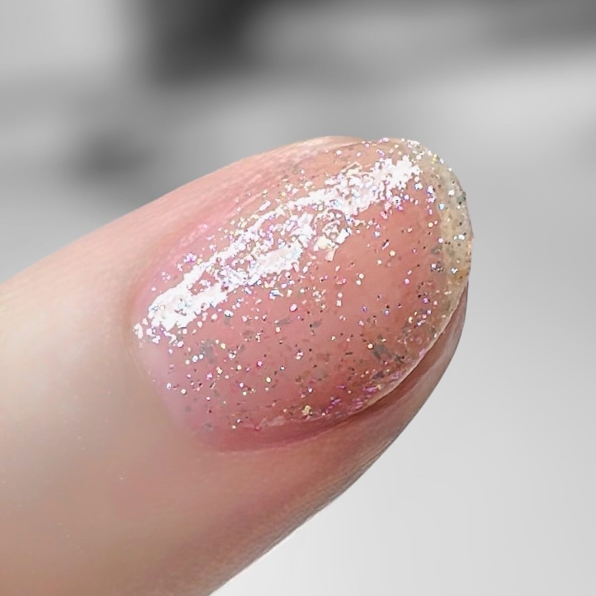 乳白色のカラーでほんのりピンクが入ったベースに細かいピンクやオレンジ系の暖色ラメが入っていて絶妙に可愛い。 今回のパケがパンダさんなのもまた可愛い🐼 Afternoon Tea限定の淡いカラーは毎回可愛くて買っちゃうんだよね🥺♡