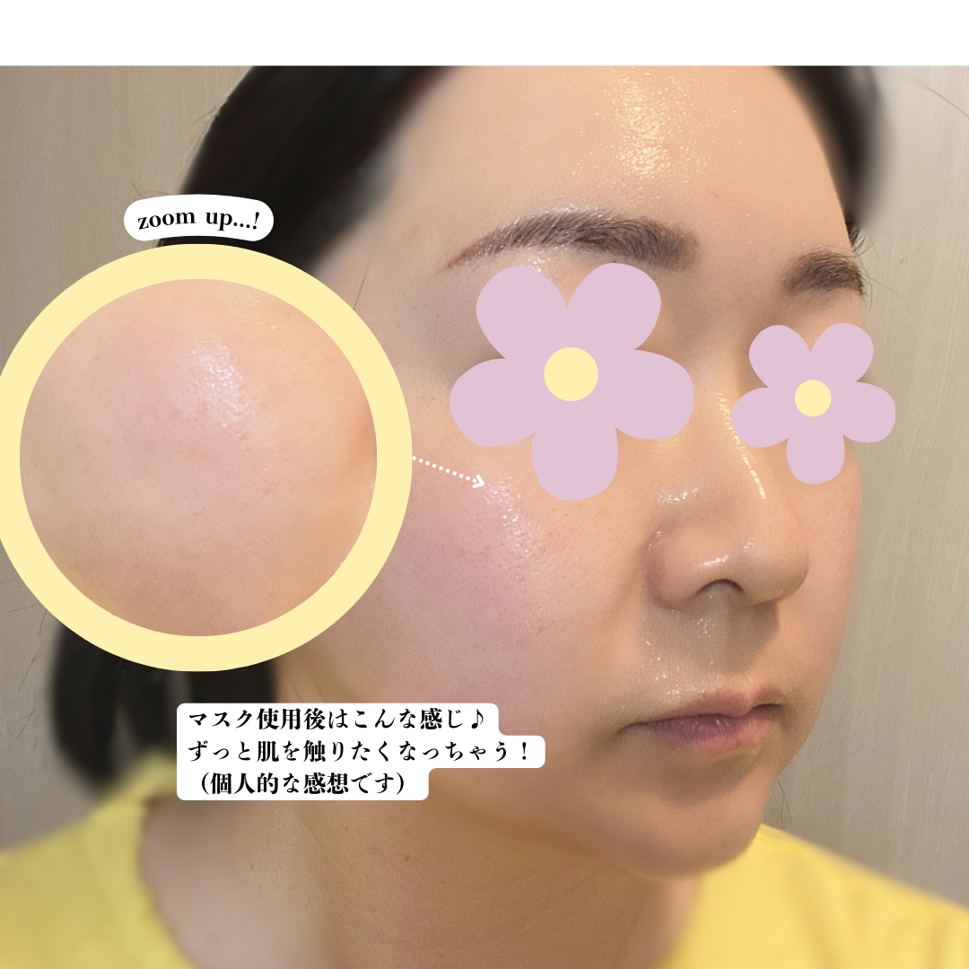 化粧水フェイスマスクとなっているところがポイントとなっていて 毎日の化粧水の代わりに使えるらしい! 大人のくすみの原因でもある糖化やメラニンの蓄積に着目した フェイスマスクで毎日の化粧水として置き換えることで うるおいが逃げにくい肌に保ち、健やかなツヤ感と透明感のある肌へと 導いてくれるそう。 そしてマスクシートですが肌触りがよくていい感じ。 あとシート自体が少し大きいからフェイスラインもすっぽりと覆ってあげられる感じがまたいい!