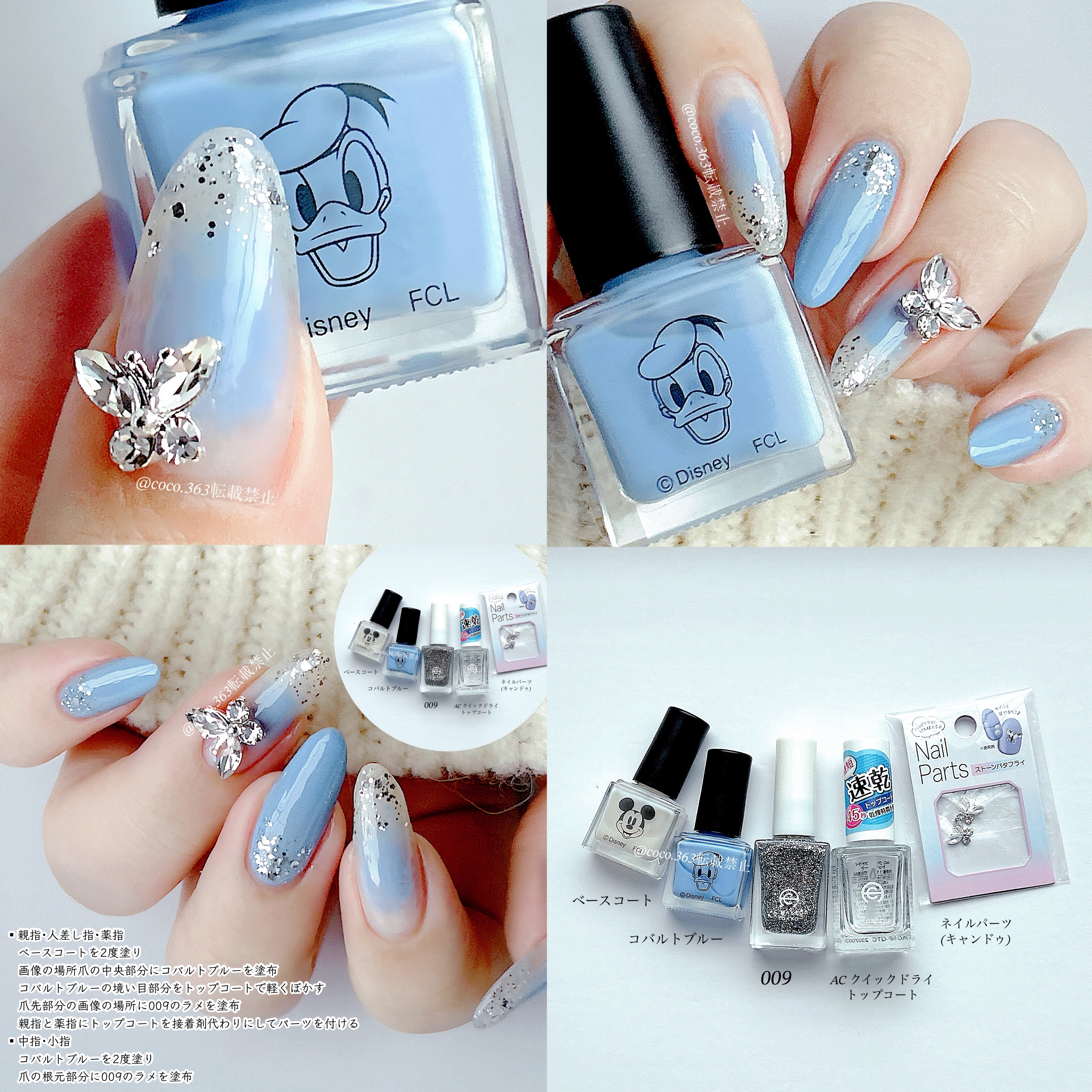 キャンメイクカラフルネイルズ N29ミルクシロップ N82クラウドレススカイ 親指、人差し指、小指は爪先にSV082で細いラインを描き、中指、薬指はAA225を重ねました。 ベースコート、トップコートはネイルホリックのものを使っています。