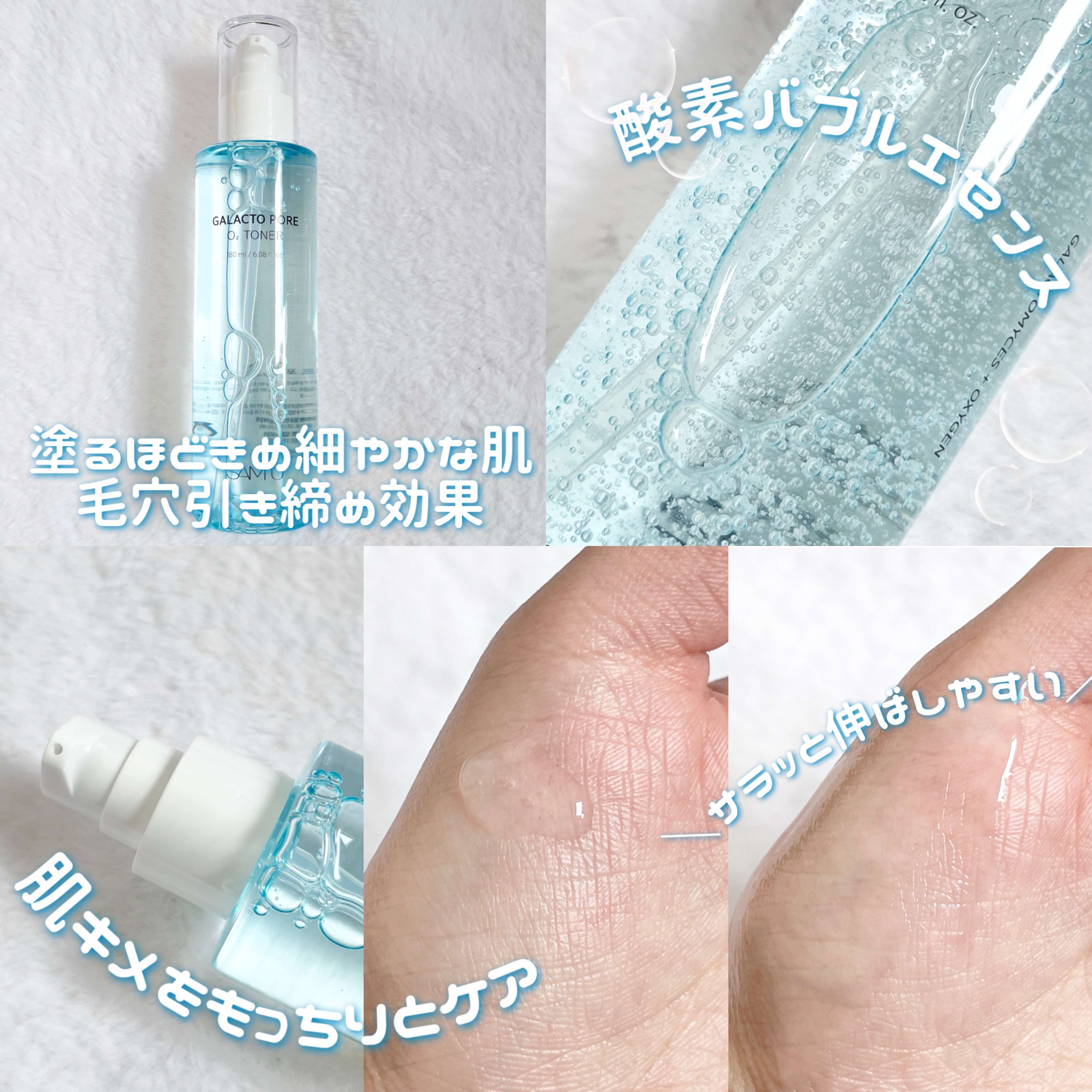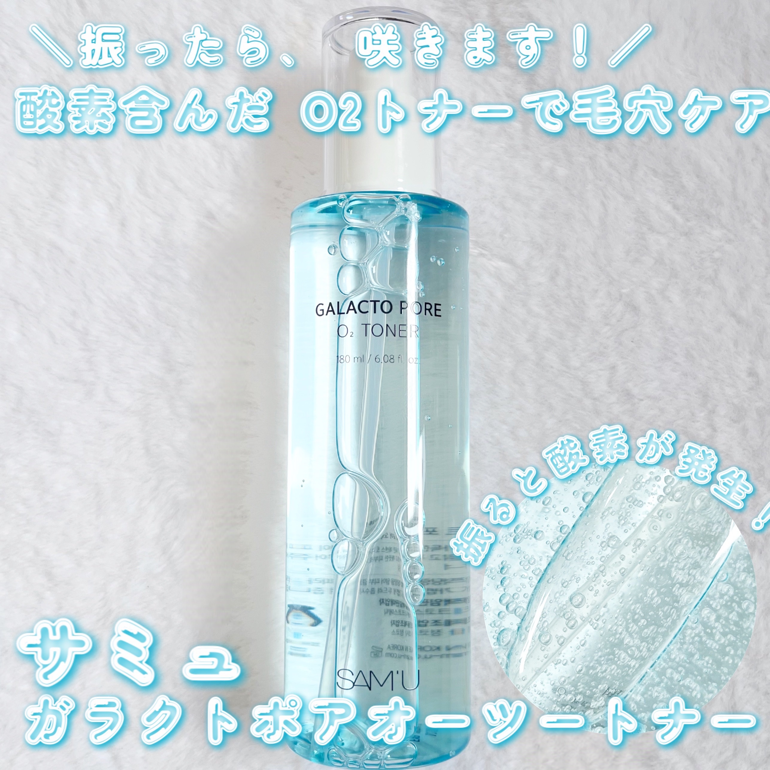- ガラクトシリーズより新しく登場したガラクトポアオーツー(O2)トナー。 新感覚の酸素を含んだバブルエッセンスが毛穴に詰まった古い角質や過剰な皮脂をケアして肌のキメを整え、イキイキとした肌印象に導きます。 敏感なお肌にもやさしい使い心地で毛穴ケアが可能です。 しっとりべたつきのないテクスチャーで朝晩使用でき、さらに乾燥による毛穴目立ちを防ぐため肌表面に潤いを与えます。 皮膚低刺激テスト完了済*。敏感肌の方もご使用いただけます。 <特長成分> ガラクトミセス発酵ろ過物 : 肌にやさしい使い心地でうるおいを与える。(保湿成分) ウィッチヘーゼル : 肌を引き締めなめらかな印象をサポート。(整肌成分) PHA : 角質ケア成分配合。(角質柔軟成分) <テクスチャー&香り> - テクスチャー しっとり伸びやすく肌になじみやすいテクスチャー - 香り シトラスハーブ系 *全ての方に皮膚刺激が発生しないということではありません