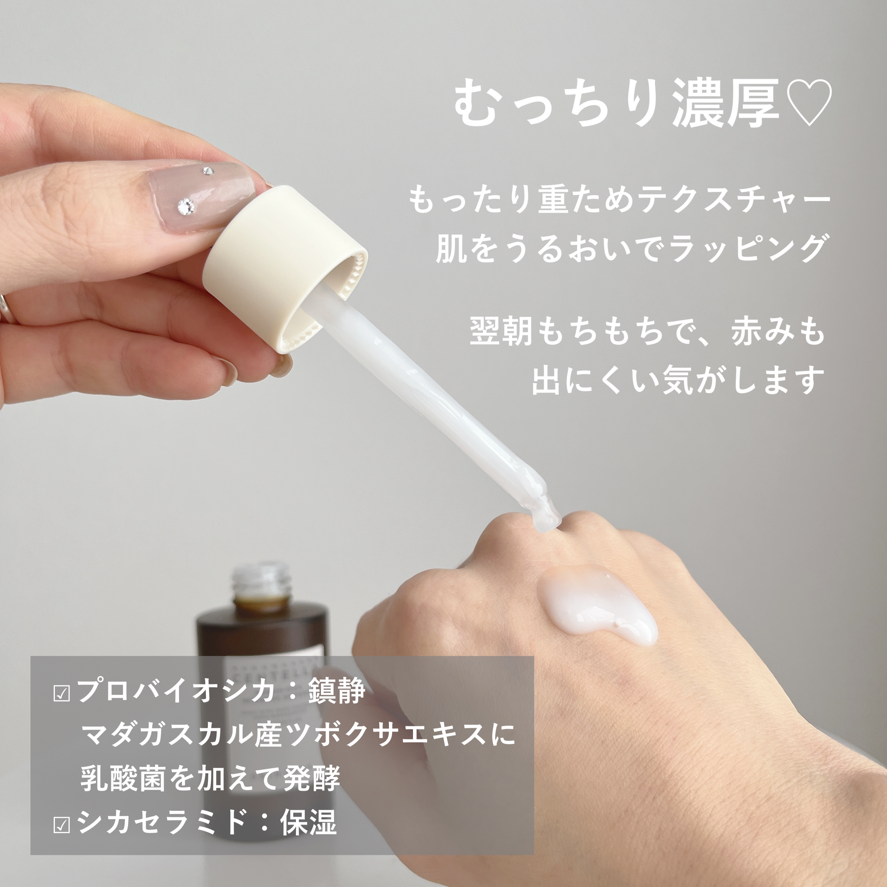 | とろみはあるけどベタつかず、伸ばしていくと肌がツヤっぽくなっていく◎ | 詳細を見る | |||