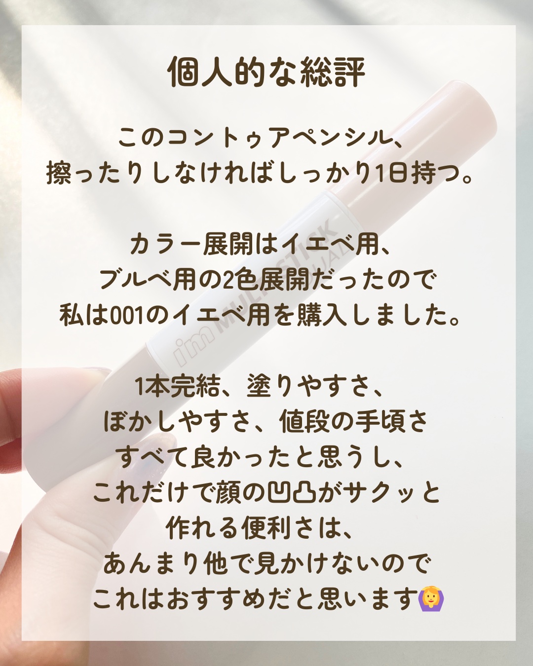 手早く済ませたい時はこのアイムミミのアイムマルチスティック デュアルを使っています♪ 指でなじませやすくて、想像以上に馴染む!! 001はイエベさん向き、002クールコントゥアリングはブルベさん向きのようですが、あまり違和感なく使えています♡ 2色使いすることで、ハッキリさせたい部分と自然に仕上げたい部分でまとまってる気がします♡