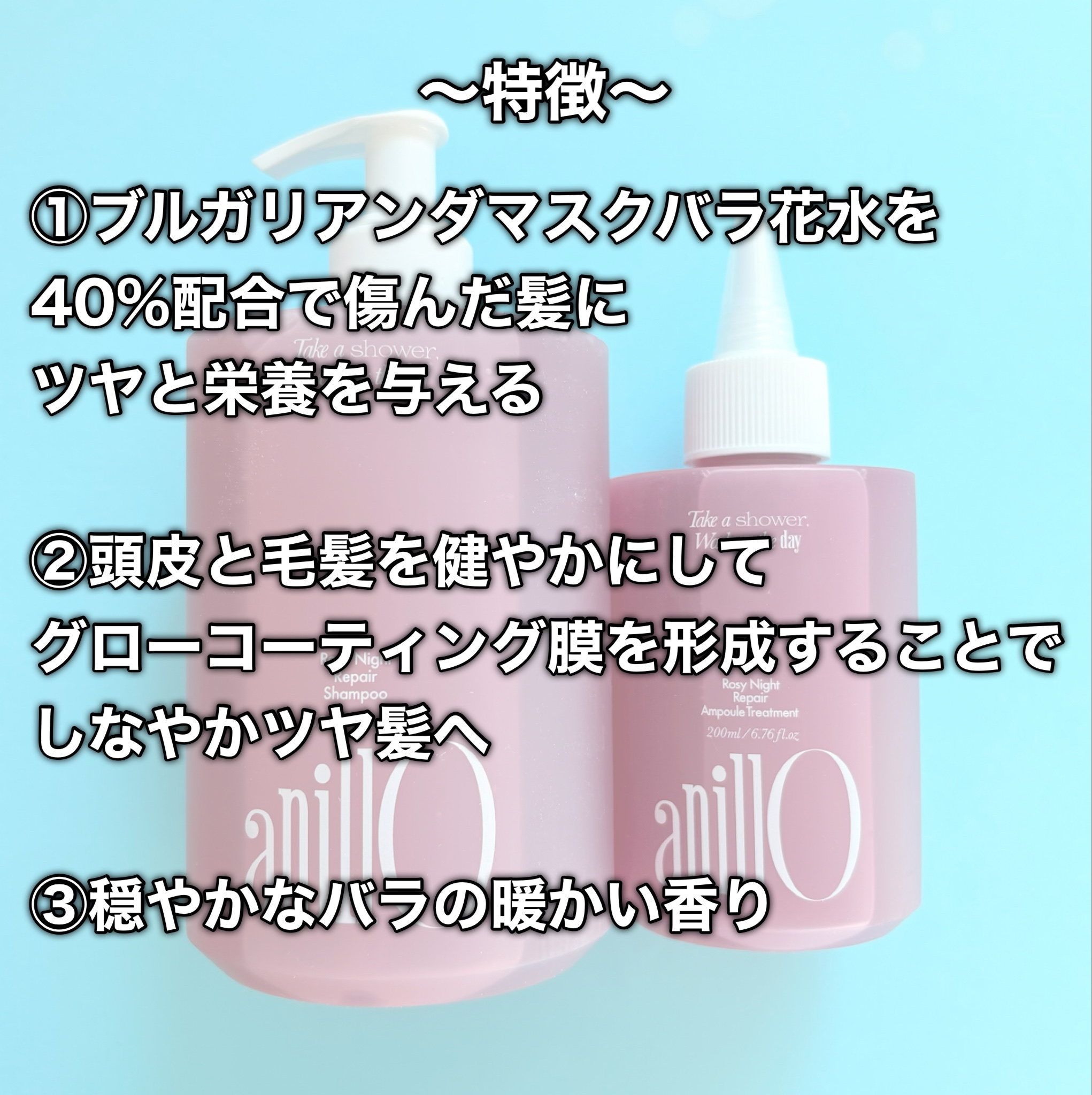 バラの香りが広がる極上ケアアイテム𓂃𓈒𓏸◌ANILLOロージーナイトリペアシャンプー/アンプルトリートメント५✍🏻⸝꙳.⋆基本情報︎︎︎︎︎︎☑︎ダメージヘアケアに特化したシャンプートリートメント(ヘアオイルもあり)︎︎︎︎︎︎☑︎ブルガリア...