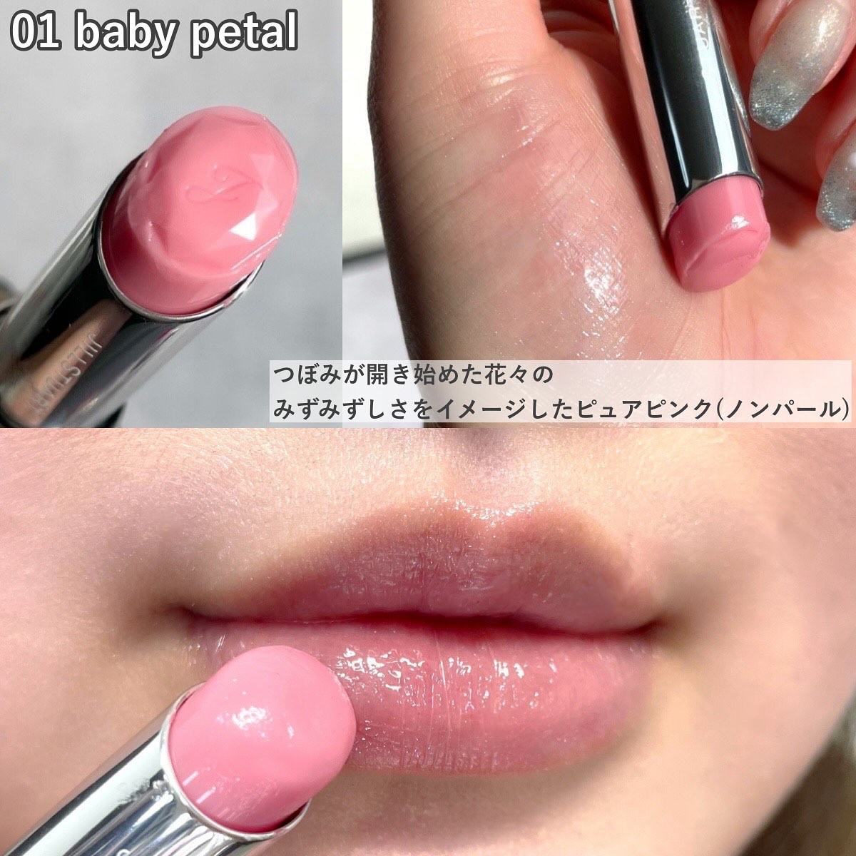 - とろけるようになめらかなタッチで、ふっくらぷるんとした唇を叶えるリップバームが新登場。 清涼感が心地よく、乾燥が気になる唇にうるおいと ツヤをあたえます。 ●デイリーに使えるシアーな発色から、ナチュラルに色づく発色まで、お好みの唇に仕上がります。 ●体温でとろけるブルームモイスチャライジングオイルや、密着感の高いペーストオイルを配合し、しっとりとろけるような塗り心地。 また、 軽いタッチのベタつかないオイルを適量配合することで、さらさらとしたのび広がりを叶えています。 ●清涼感を感じる成分により、 つけた瞬間からスーッとひんやり感じます。 ●密着感の高いオイルとペーストオイルを配合することで、厚い膜でぷっくりとした唇に。 さらに、 塗布膜の均一性を出すオイルがつるんと したツヤ高さを叶え、唇の凹凸をフラットにしながら、縦ジワが目立ちにくい立体感のある唇へとみちびきます。 ●水分を保持するブルームモイスチャライジングオイルにより、うるおい感が持続します。 ●アルコール (エチルアルコール) フリー、パラベンフリー。 ●クリスタルフローラルブーケの香り。