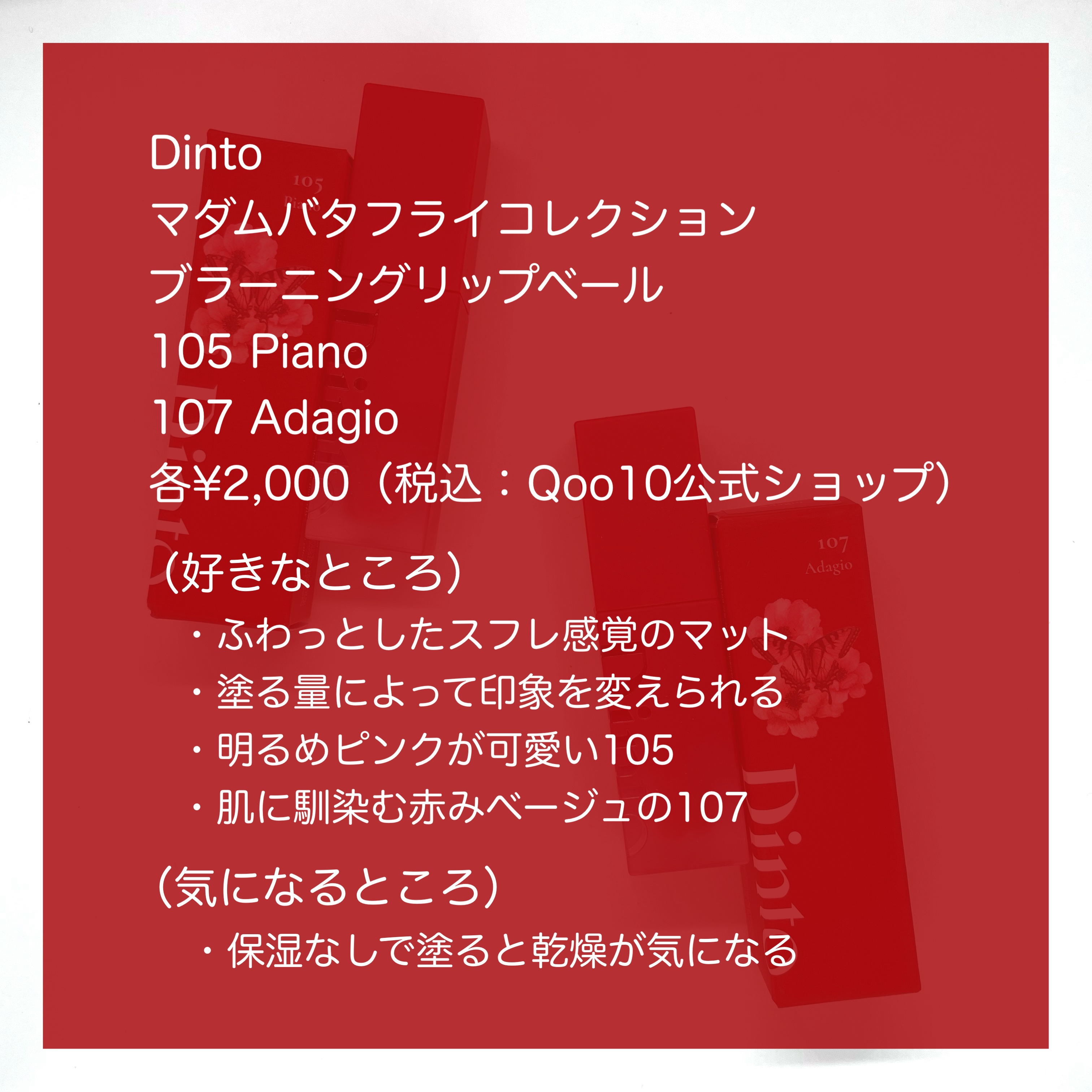 今回のコンセプトでもある、【マダムバタフライ】って…?小説とオペラにインスパイアを受けたコレクション。 ふわふわとしたエアリーで軽いつけ心地。滑らかでスフレのようなテクスチャーで唇に優しく塗布することが可能🎀 カラー展開は全10色になります!101 Rubato 102 Legato 103 Fermata 104 VIvace 105 Piano 106 Andante 107 Adagio 108 Dolce 109Crescendo 110Cho-Cho