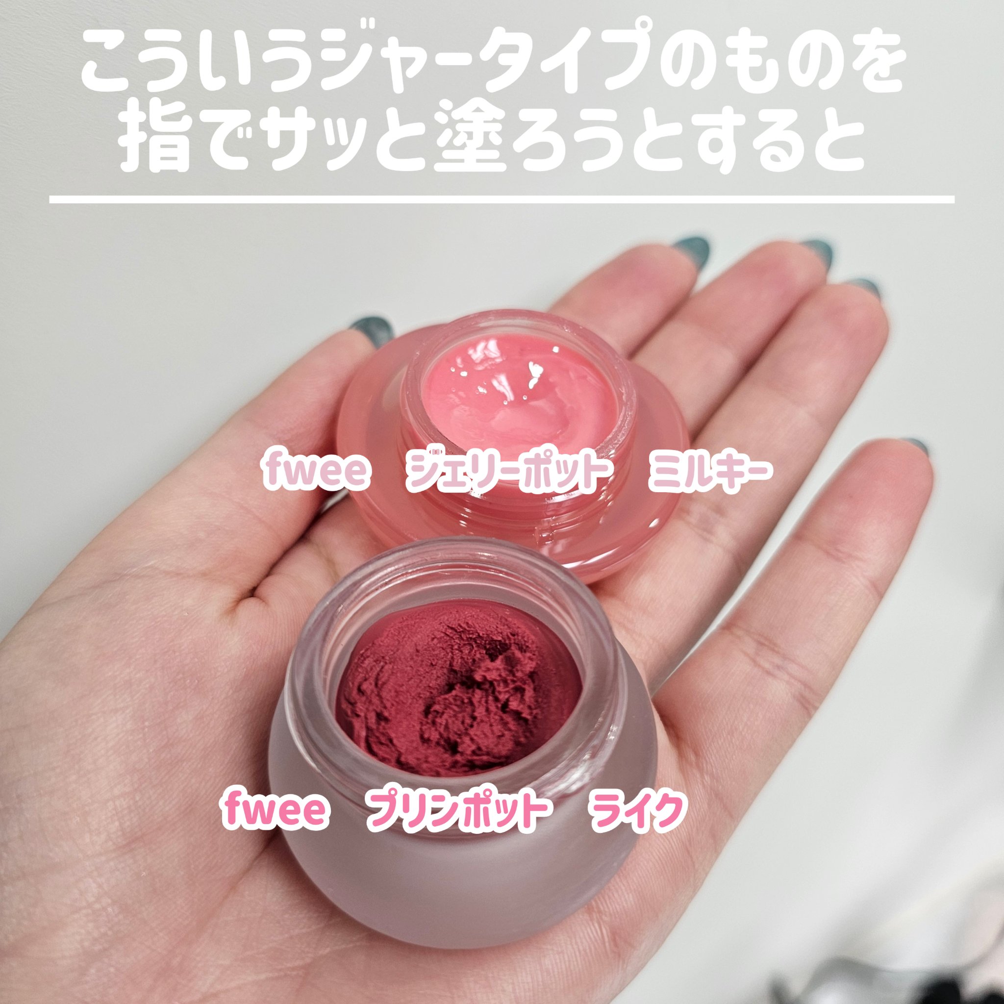 指が汚れなくなっただけでなく、fweeのプリンポットチークはかなり発色がよいためよく付けすぎたりムラになったりしていましたが、それもなくなりました! シリコンタイプなのでティッシュ等で軽くふき取ったらすぐにキレイになります! ただ、ほっぺにつける際は横に擦りながらつけるよりはトントンと叩くようなイメージでつけないと、摩擦で色がついたと錯覚してしまうので注意です⚠️ 結果として、私はリップブラシを買ってから指が汚れない、さらにぽわっと発色で使えるようになったので買って良かったです!!