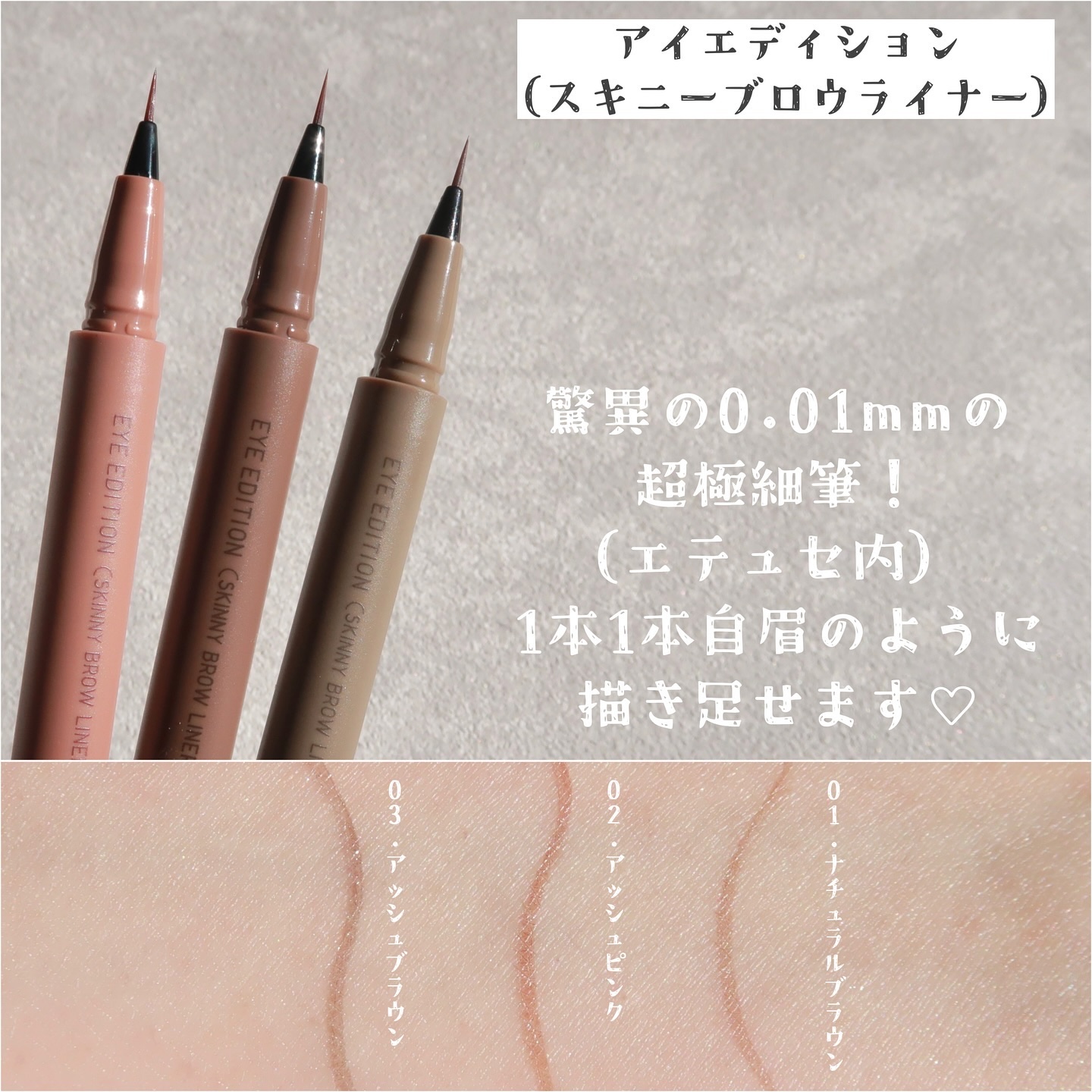 今季のエテュセも相変わらずオシャレで可愛いカラーがたくさん! 数量限定商品もあるので気になる方はぜひチェックしてみてください🐰 アイエディション スキニーブロウライナー 01 ナチュラルブラウン ¥1,430 🛍️2024年11月21日(木)発売