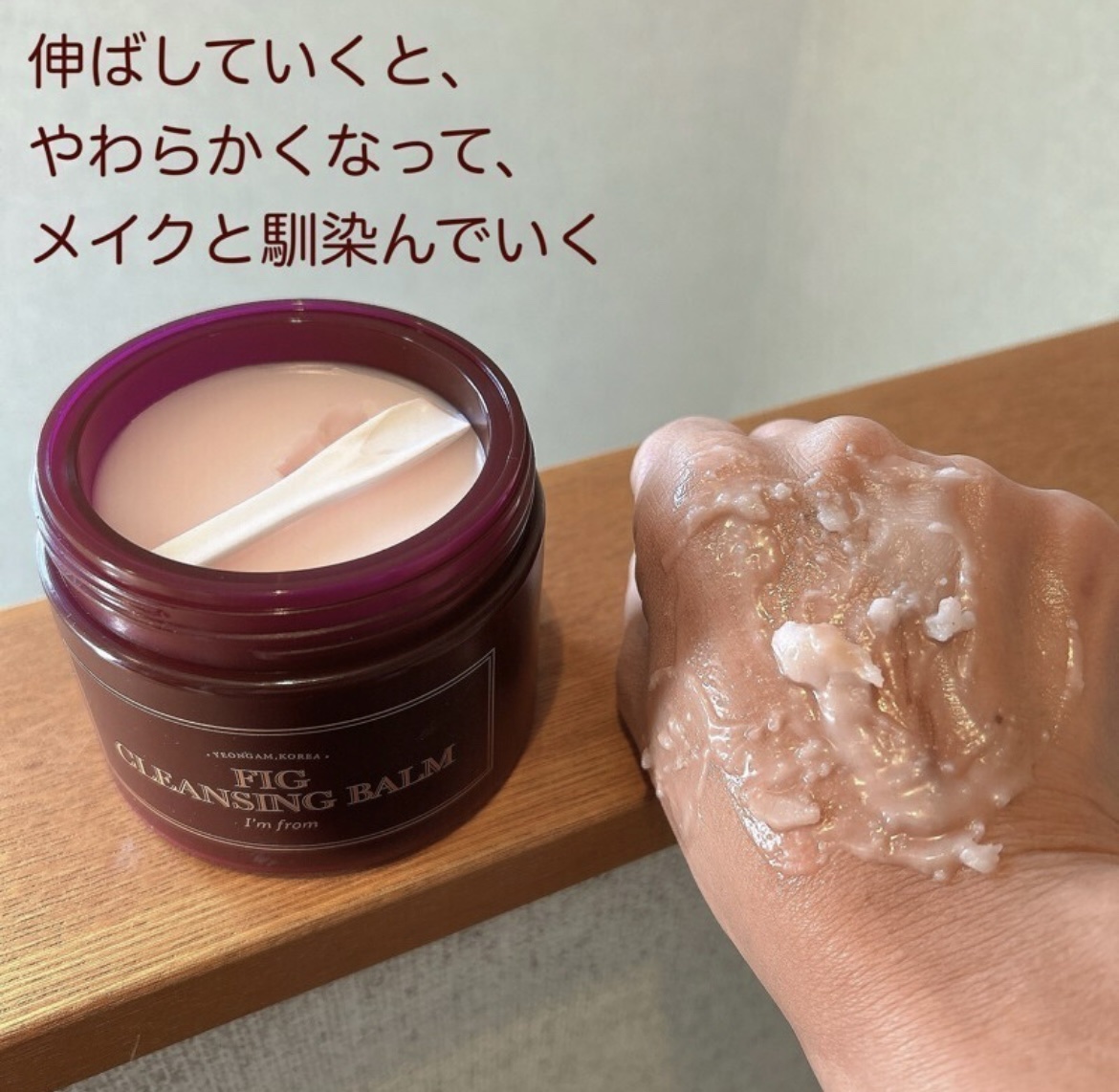 シャーベットテクスチャーのクレンジングバームが肌に乗せた瞬間やさしく溶け濃いメイクまできれいにしっかりオフしてくれるよ👍🏻 イチジクオイルウォーターが溶けて角質とブラックヘッドをきれいにケア🙆🏻♀️💓 蓋を開けると、ふわ〜とフルーティーフローラルの香りが広がって香りを楽しみながらクレンジング出来るの🌷