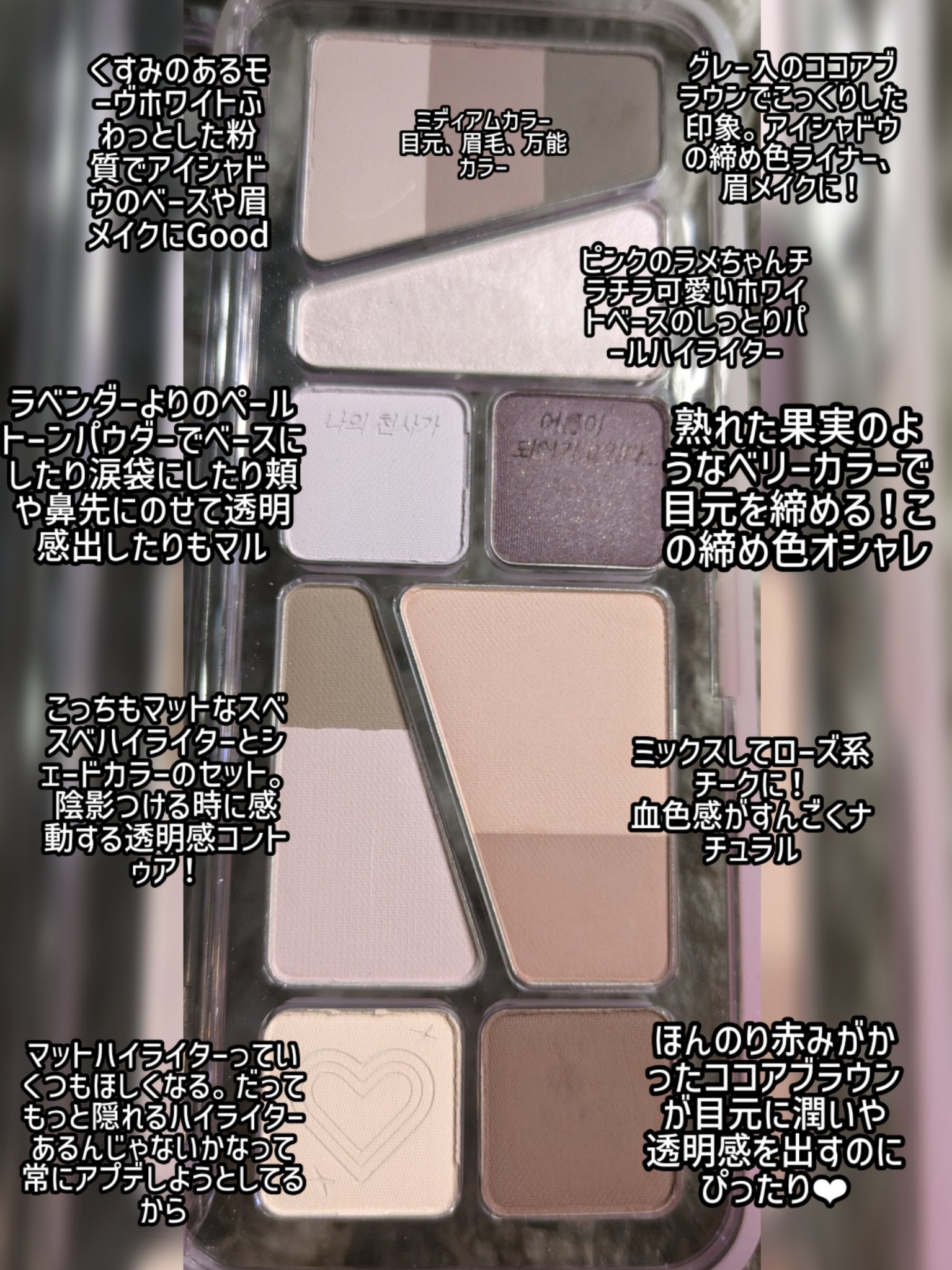 - 軽やかテクスチャーが目元に密着し、抜け感のある色使いが楽しめるデイリーパレット <101 ローズダイアリー(ROSE DIARY)> オーナメントを飾り付けたローズツリーのようにほのかに輝くウォームローズピンクカラー(イエベ秋)。 <102 ミュートアーカイブ(MUTE ARCHIVE)> 少女たちのピンキーなホームパーティームードを盛り込んだクールでヌーディーなミューテッドモブカラー(ブルべ夏ミュート)。 <103 バニラヘイズ(VANILLA HAZE)> 焼きたてのジンジャークッキーのように暖かく香ばしいウォームミュートカラー(イエベ秋ミュート)。 <104 GHR ピンク(GYEONGHOERU FLOWER FESTIVAL)> 春の日の美しく優雅な色を詰め込んだピンクカラーパレット。イエベ春&ブルベ夏におすすめのパレットです。 <105 DSG バイオレット(DEOKSUGUNG STONE WALL ROAD)> ほんのりピンクがかった柔らかなモーブカラーパレット。ブルベ夏&ブルベ冬におすすめのパレットです。 <106 DBG コーラル(GYEONGBOKGUNG STROLL)> 明るい日差しの色を取り入れたデイリーなコーラルカラー。イエベ春&ブライト秋におすすめのパレットです。
