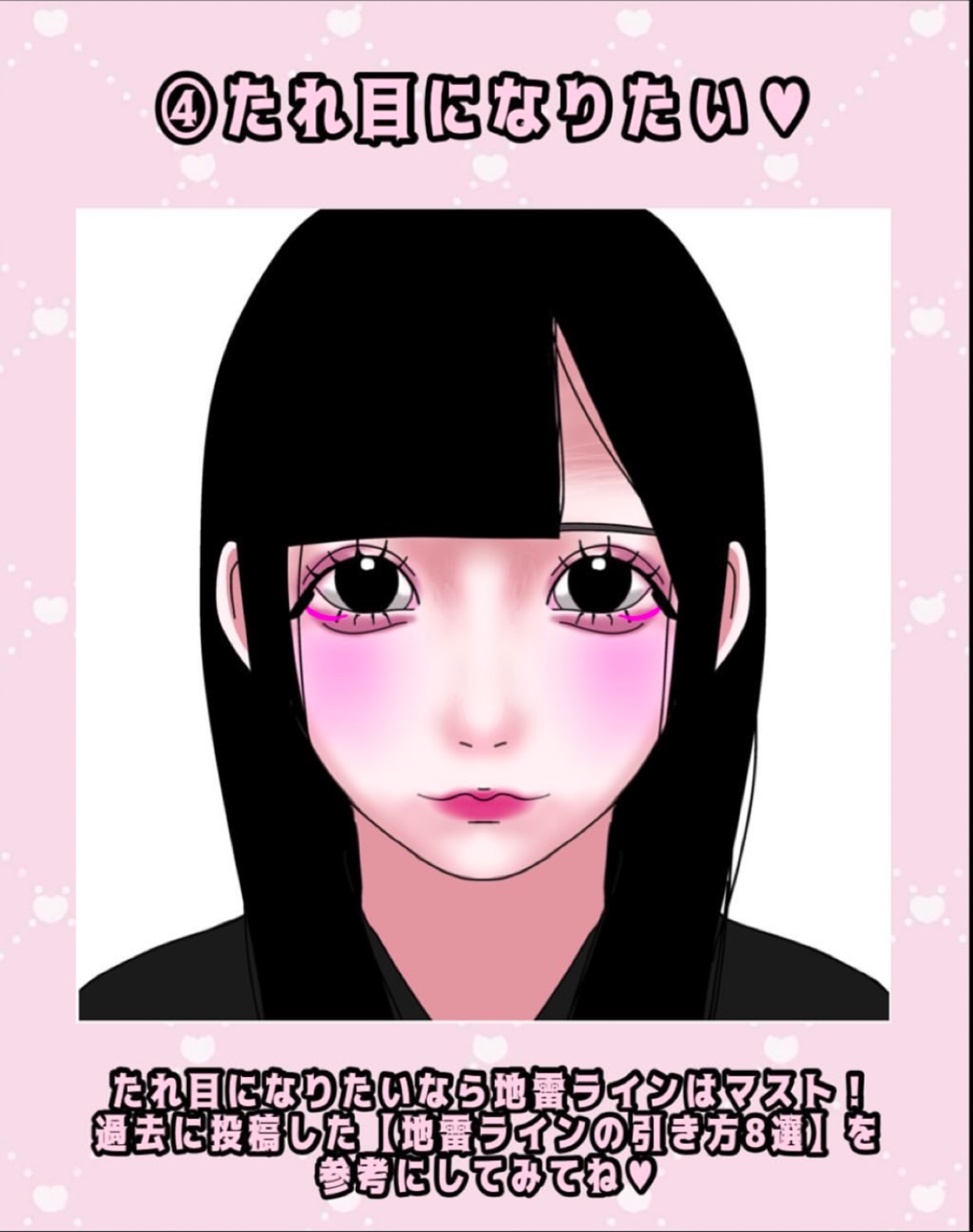 王道地雷ライン 黒目の真下からまっすぐに引くのがポイント♥ お人形さんシャドウ 濃いめのシャドウで目尻を埋めて甘めお人形さんアイに♥ 令和の地雷ちゃん 思いっきり垂れさせた地雷ラインがアツい!