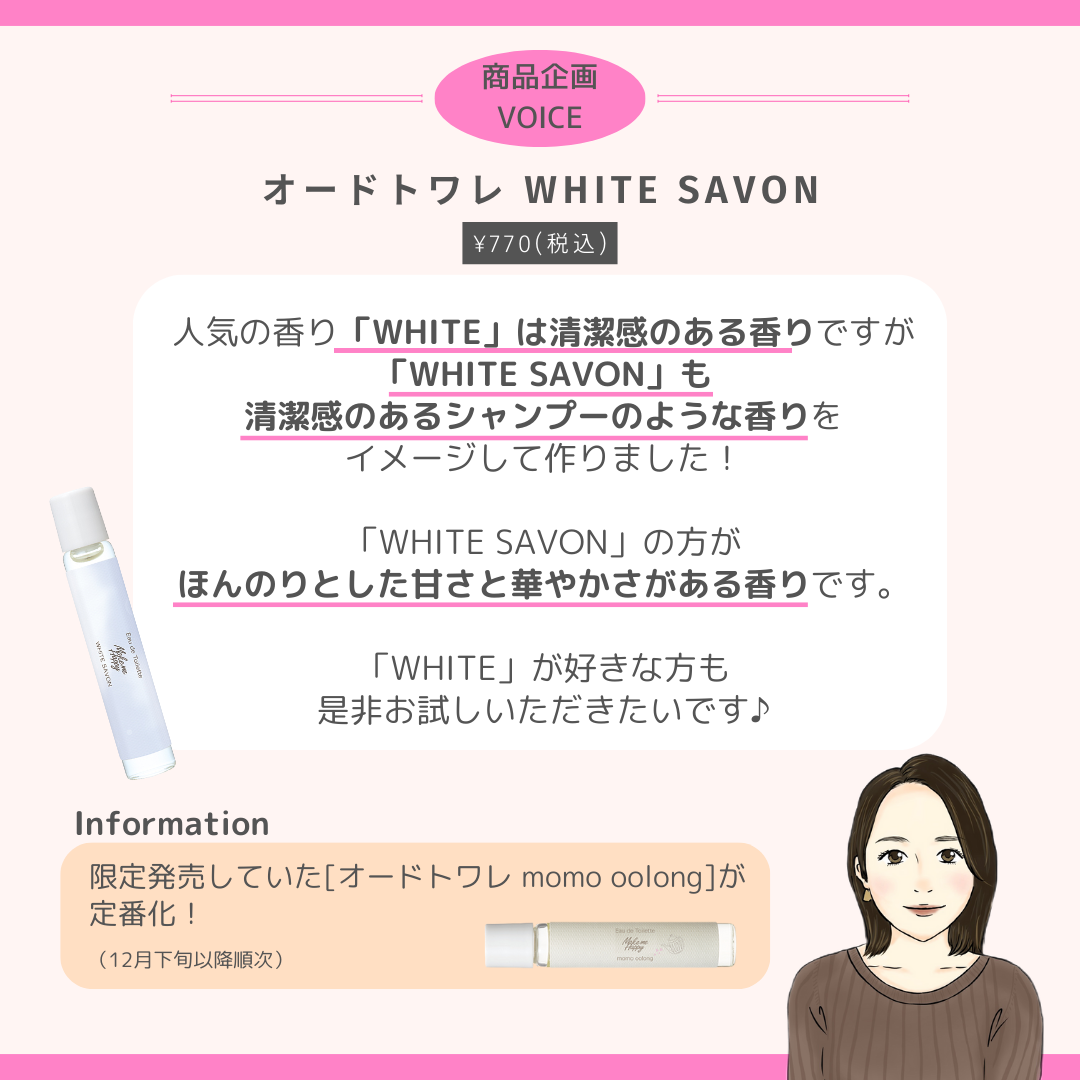 - つける量を調整しやすいロールオンタイプのオードトワレ。 持ち運びにも便利なサイズです。 サトウキビ由来の植物性アルコールを使用。 WHITE SAVON(ホワイトサボン) 清潔感のあるフローラルサボンの香り TOP:グレープフルーツ、アプリコット MIDDLE:ジャスミン、イリス、ヒアシンス LAST:シダーウッド、サンダルウッド、バニラ、ムスク