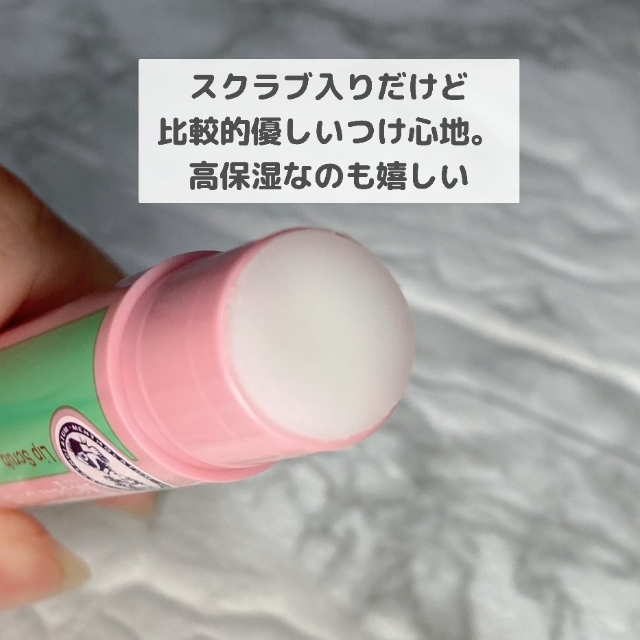 角質ケアしつつ保湿ケアもできるスクラブリップ。シュガースクラブ(スクロース)だそうです。 スクラブの刺激少なめでやさしくケアできます。弱いのかと思ったけど、そうでもないよな…効果について詳しく言及できないけど結構いいかも。 無香料で変な味も香りもしません。ベースは体温でスルスル溶けてべたっとして、バーム、オイル、ワセリン系の高保湿リップみたいです。