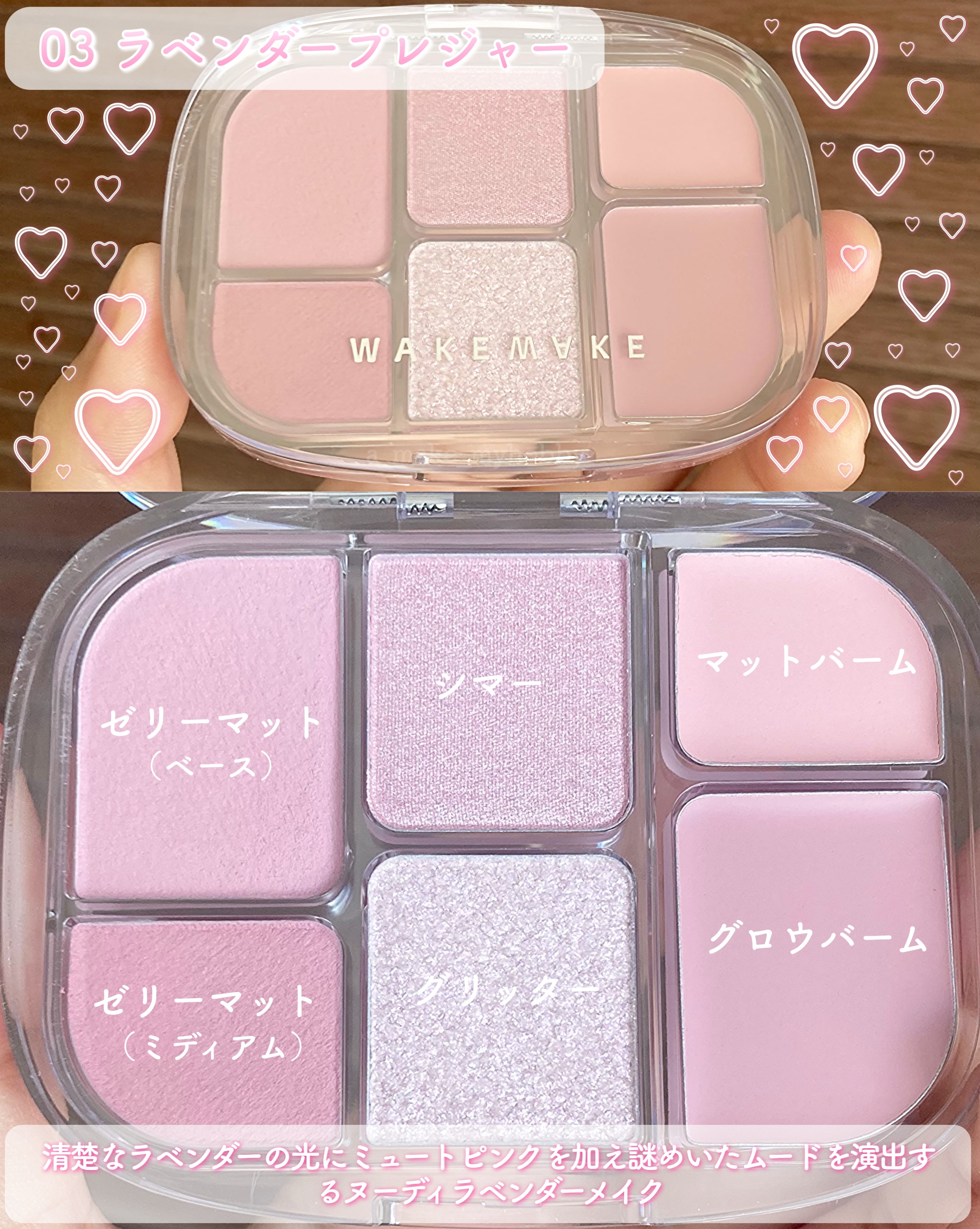 韓国最大級のヘルス&ビューティストア “オリーブヤング”発のメイクアップブランド WAKEMAKE(ウェイクメイク)。 モチモチしたテクスチャーのゼリーマット、シアー/グリッターテクスチャー、バームテクステャーの3つの異なるテクステャーで構成された6色パレットはアイシャドウだけでなくチークやハイライターとしても使えるんです。 特に私のお気に入りは 『02 レイジーローズ』。これひとつで、可愛いメイクも大人っぽいメイクも完成する優秀カラー。
