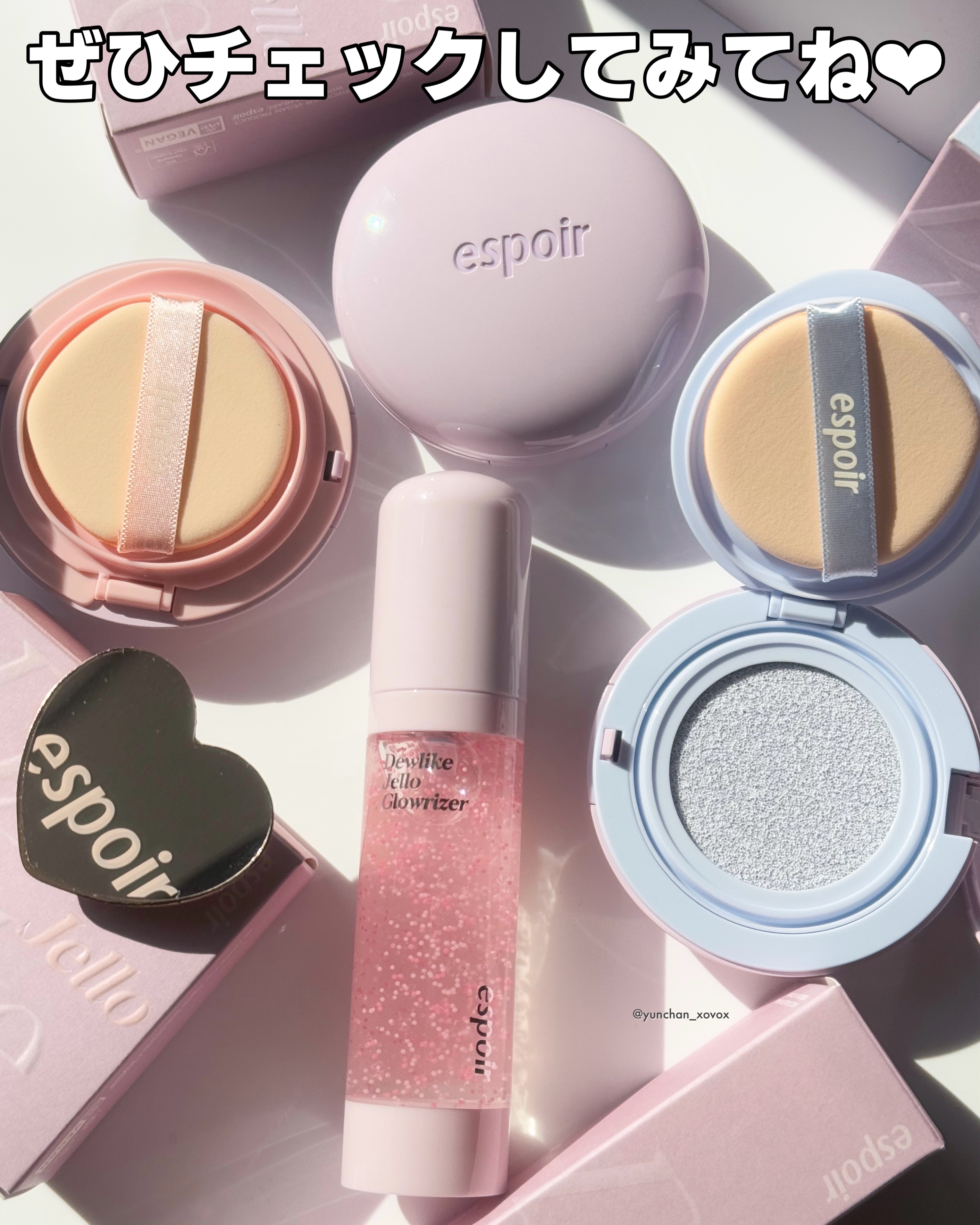 ゼリーのようにぷるんと水光肌へ🩵 今回はespoirのトーンアップクッション!ファンデの前に塗ることで肌のトーンアップをし透明感のあるみずみずしい肌へと✨️ 私が今回使用したのは【スノーブルー】🩵 反射板を当てたようにくすんだ肌をトーンアップして透明感のある肌へ 高保湿ヒアルロン酸とセラミド配合で乾燥せずしっとり一日中快適な肌へ