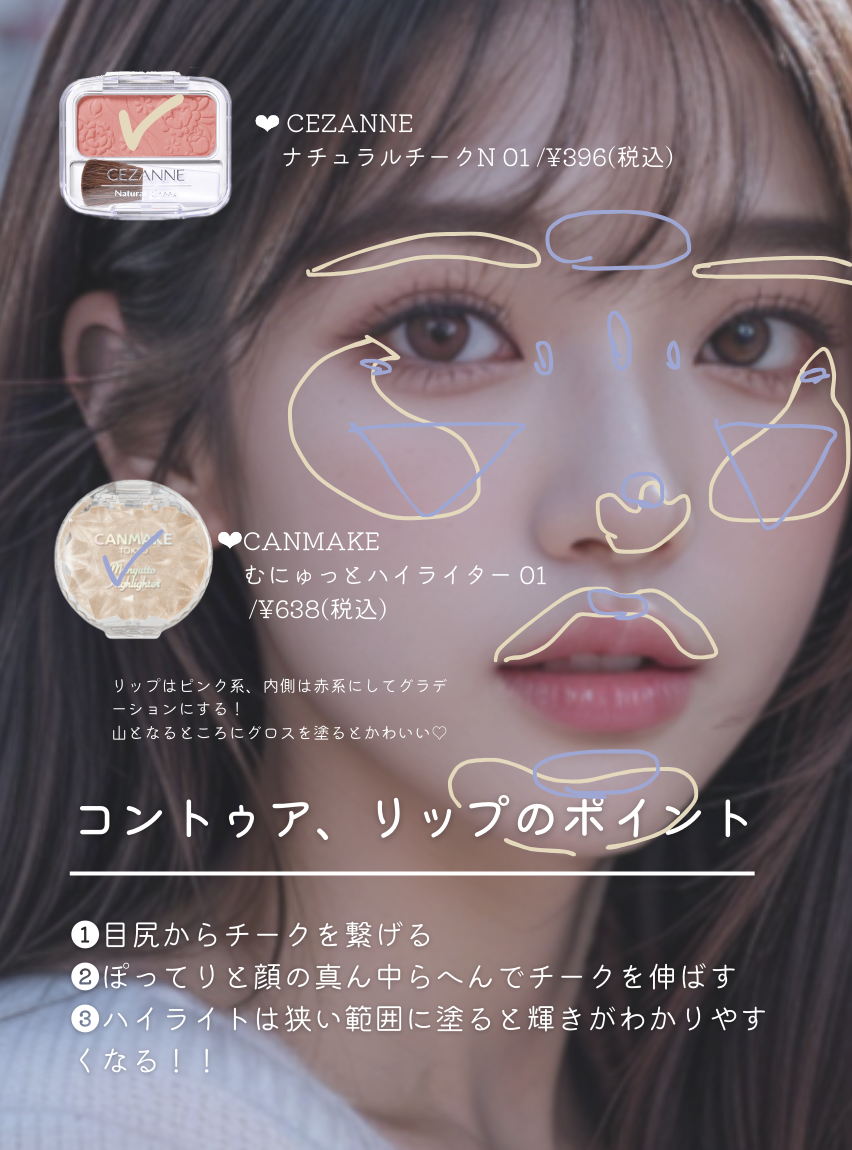 とにかく盛れるのでぜひやってみてほしいです…! Biore' UV アクアリッチライトアップエッセンス/¥1078(税込) CANMAKE グロウフルールチークス(ブレンドタイプ) 01/¥880(税込)