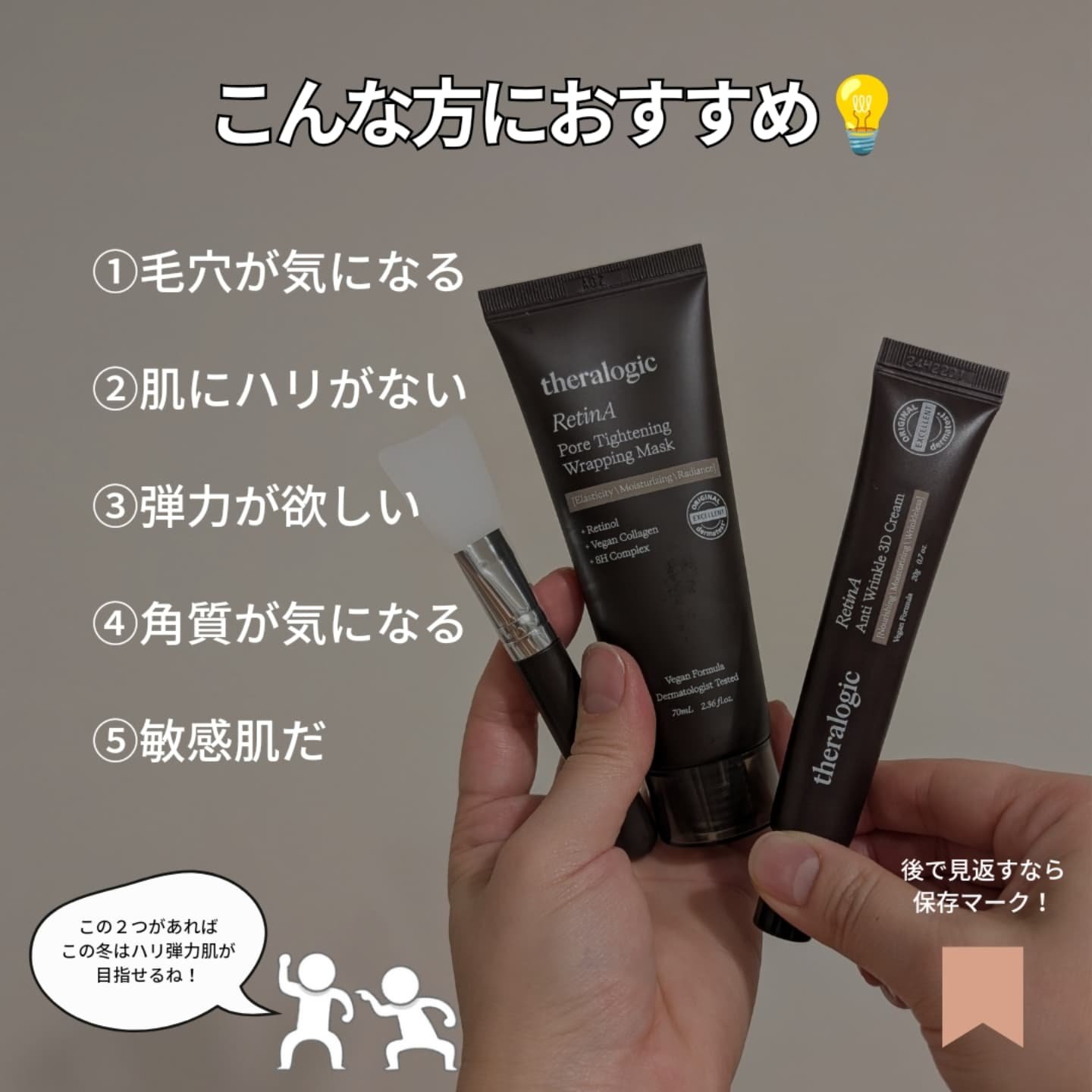 韓国トップの皮膚医院『ドクターズ皮膚科』の皮膚科専門医が開発したスローエイジングヴィーガンダーマコスメティックブランド「theralogic」 テラロジックのレチノールシリーズは、大人の毛穴悩みに特化した製品です。使い続けるほどに、毛穴も改善されハリと弾力のある肌になることが期待できます✨ テラロジックのアイテムは皮膚科医開発で安心して使えたことと、効果を実感できたので続けていきたいと思います✨