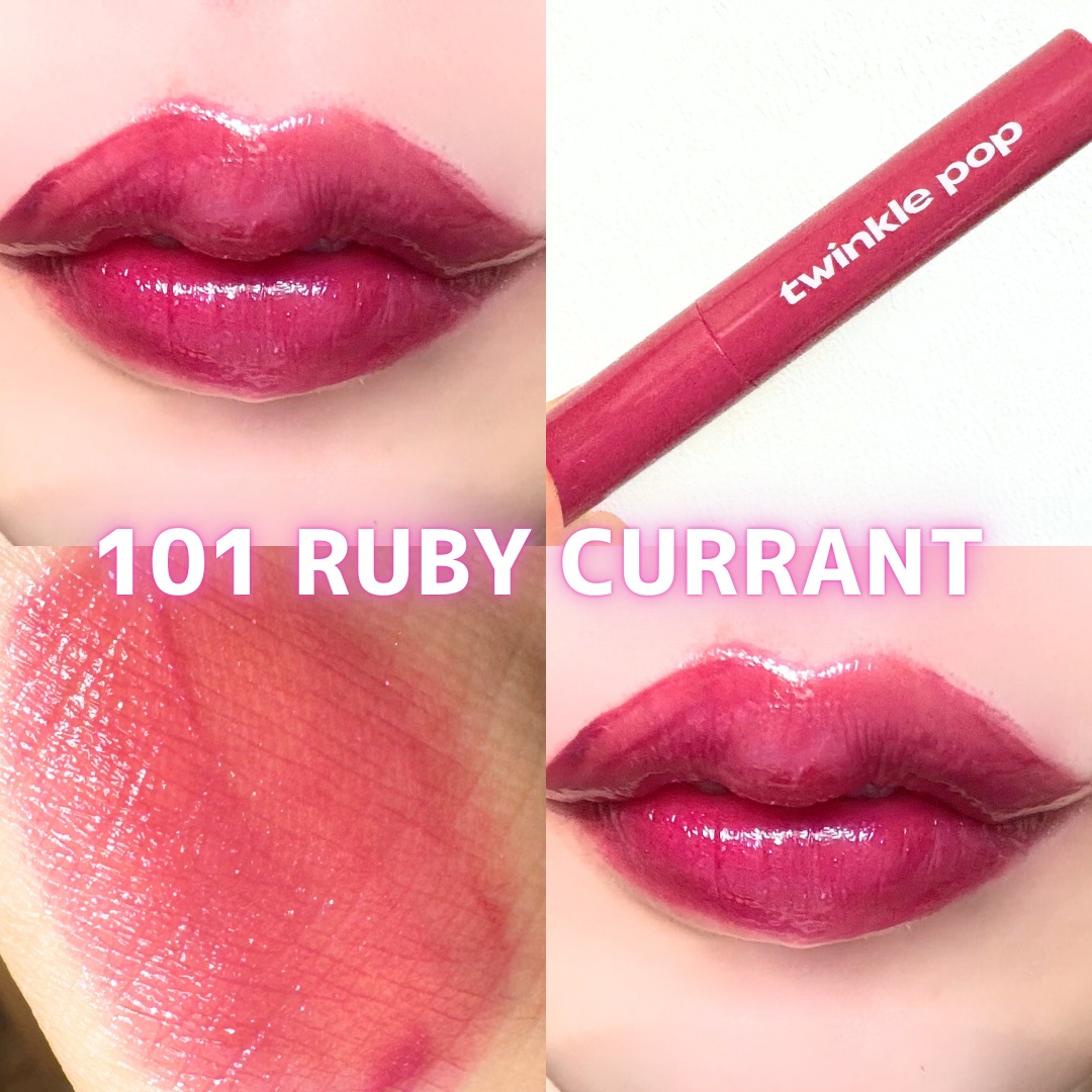 ピュアグラスティント 色味は100 HUG BEIGE 派手すぎないコーラルベージュ系カラー、101 RUBY CURRANT 色っぽいルビーカラーだよ やわらかい質感でピタッと密着。 グリッターみたいなキラキラなラメがかわいいよ! ガラス玉のような光沢感のリップティント ベタつかず、軽い付け心地。