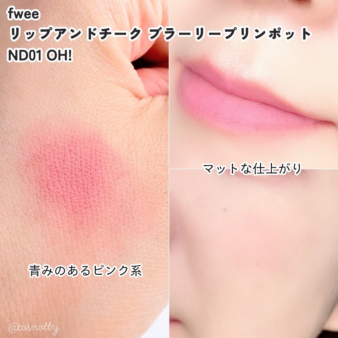 コロンとした丸みのある可愛らしいデザイン。ふんわりとしたムースプリンのようなクリーム質感のリップアンドチーク。肌に馴染ませるとサラッとしているマットな使用感です。 ND01 OH!は、くすみ感のないフレッシュな青みピンクカラー。好みの濃さに、またパウダーチークと重ねることも出来るのでイエベでも可愛らしい青みピンクカラーに挑戦しやすかったです。 値段も手頃で色展開も豊富なので、コーラル系やピーチ系のカラーも集めたくなりました。