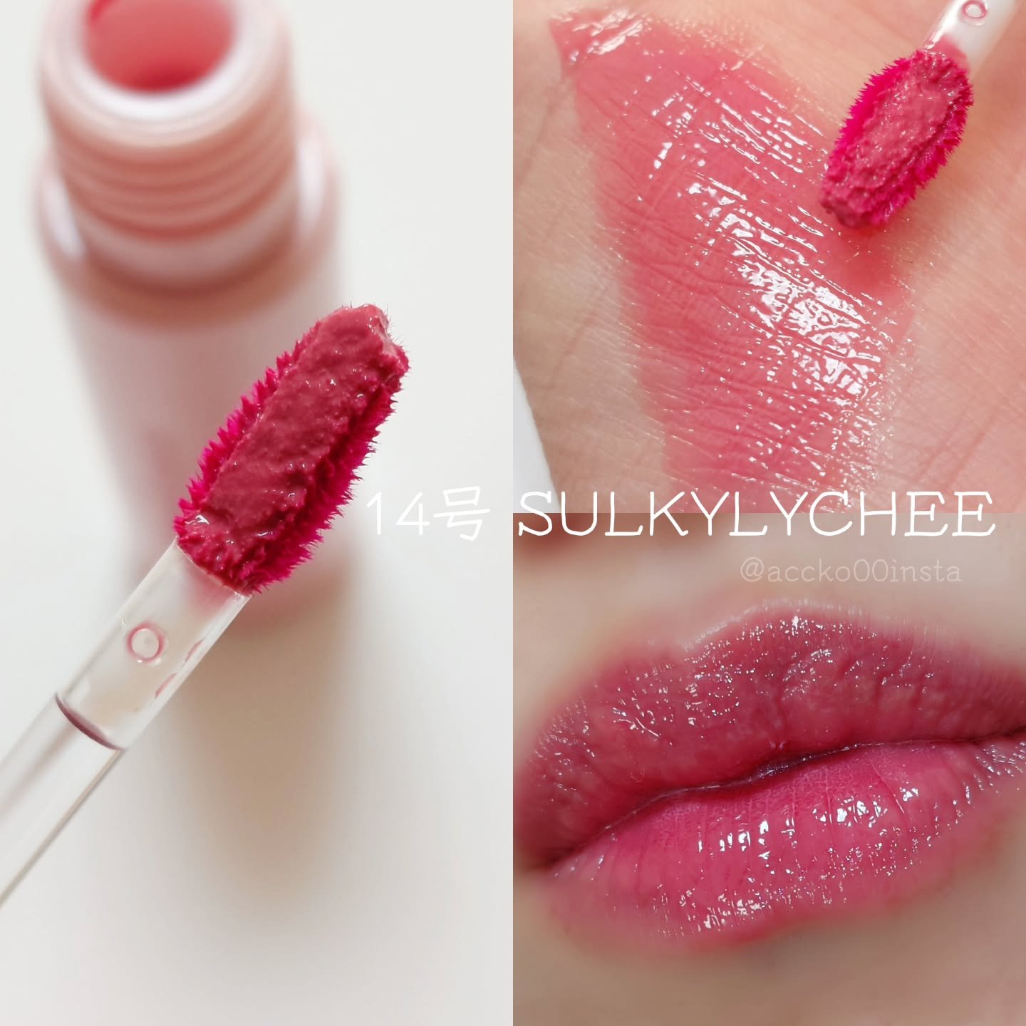 もちツヤフルーツ飴ティント🍎🍓 14サルキーライチは柔らかいライチの果肉のようなデイリーに使いやすいソフトピンクカラー🩷 淡めの色なのに色残りは割としっかり! 仕込みリップとしても使い勝手が良い✨