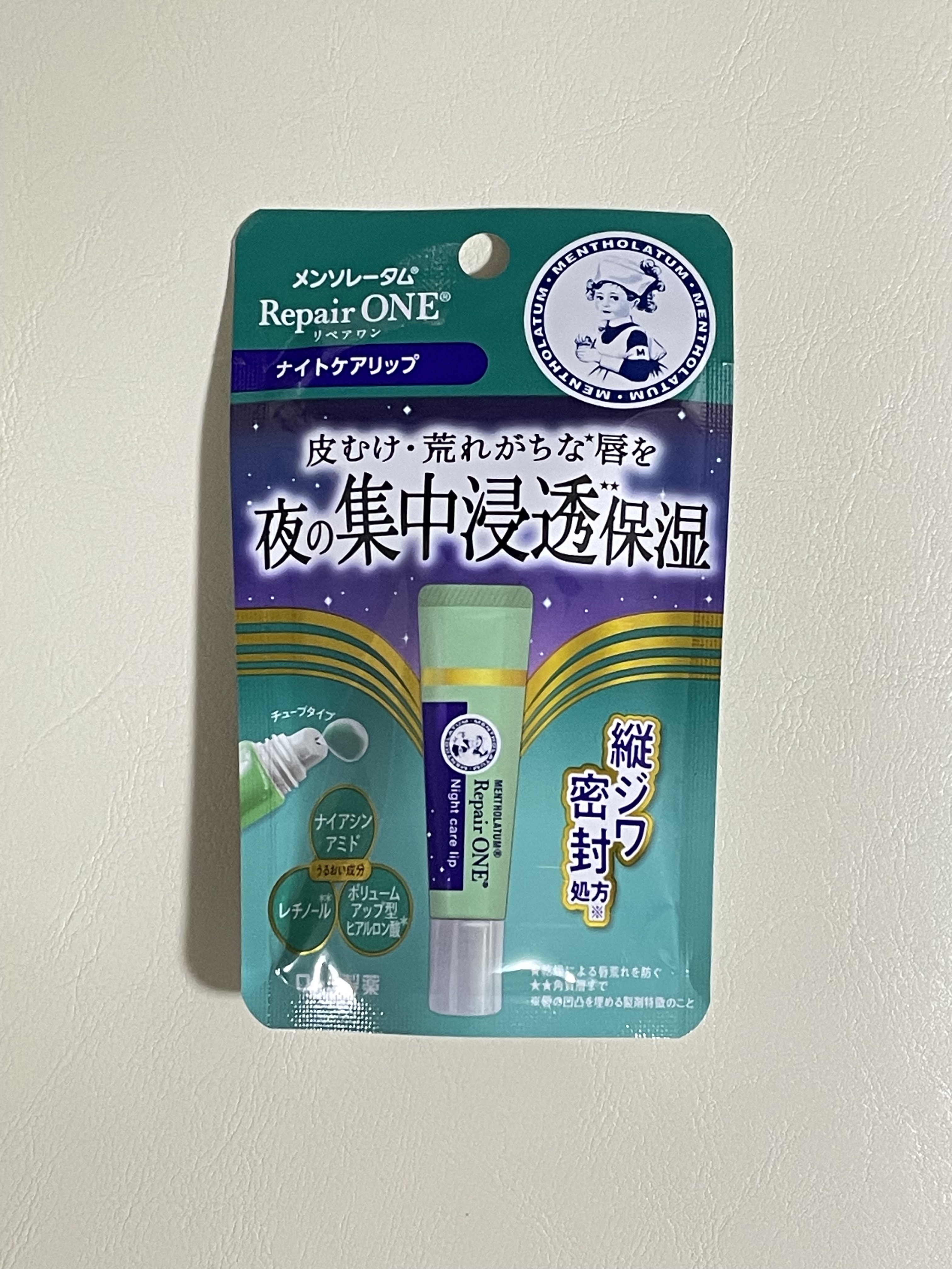- ※商品パッケージは予告なく変更する場合がありますのでご了承ください。 「メンソレータム リペアワン ナイトケアリップ」は夜塗って集中浸透*1、3つの美容液成分(うるおい成分)配合で保湿パックできるリップエッセンスです。 唇をすこやかに保って荒れを防ぎ、ふっくらとうるおいのある唇に導いてくれます。 さらに、チューブタイプで使いやすく、のびがよく唇の凹凸を埋める縦ジワ密封処方*2も特徴的。 夜塗ってふっくらうるおった唇へ。 *1角層まで *2唇の凹凸を埋める製剤特徴のこと