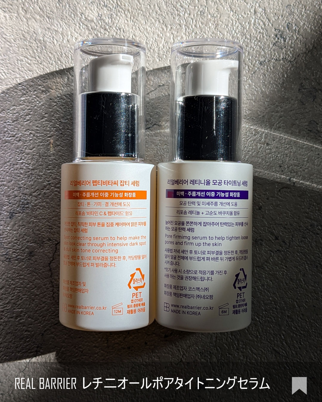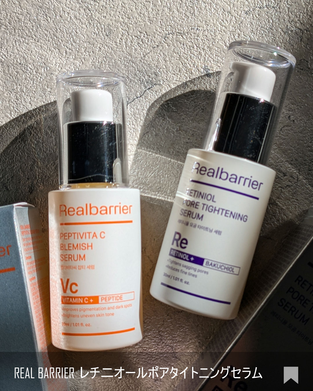 愛用してるリアルバリアのクリームから新作セラムが🥹🤍🤍 ☀️ ペプチビタC ブレミッシュセラム •シミ、くすみが気になる方 •黒ずみ毛穴が気になる方 •くすんだ肌トーンに悩んでる方 レチ二オールポアタイトニングセラム •広がり、伸びだ毛穴が気になる方 •弾力、たるんだ肌が気になる方 •ざらざらで乾燥した肌質が気になる方 朝ビタ・夜レチ におすすめ美容液✌️ ̖́-
