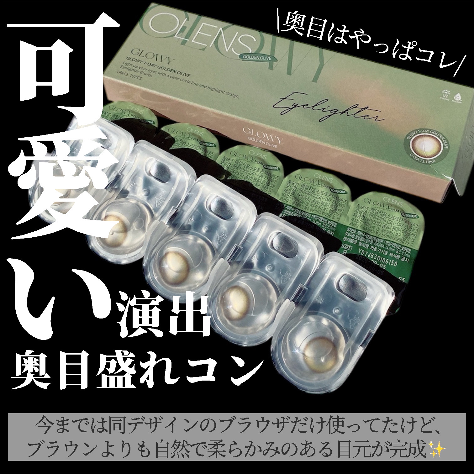 \初心者の方でも使いやすいオリーブレンズ🫒/♡OLENSGlowy1day☑︎GoldenOlive¥1,760税込繊細なハイライターパターンで立体的に輝く目元を演出🫧オリーブカラーだけど、カラーも濃すぎないから普段使いもしやすいナチュラルな...