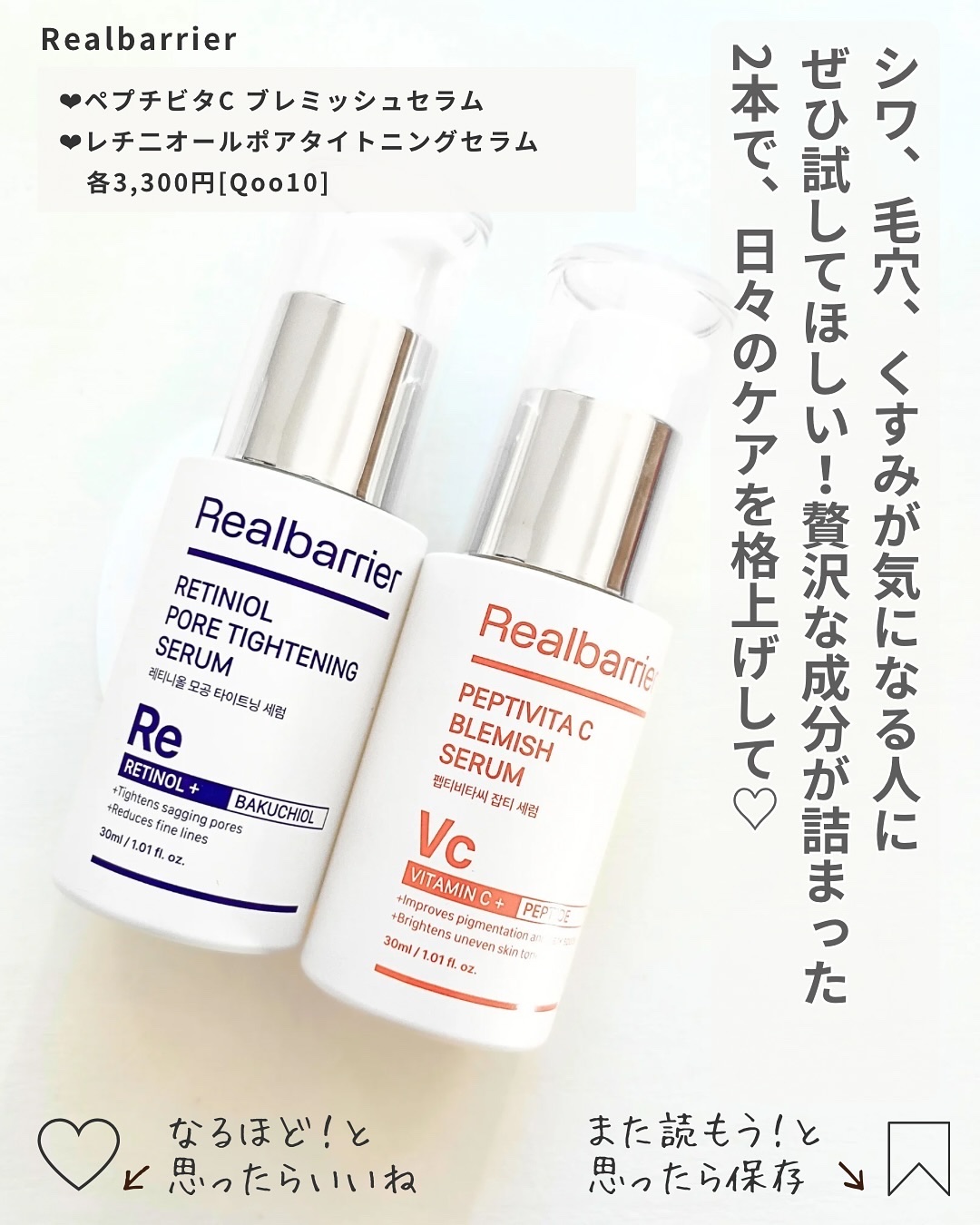 新エイジングケアシリーズ登場🥰 Realbarrier(リアルバリア) ☀️ペプチビタCブレミッシュセラム 🌙レチニオールポアタイトニングセラム 透明感のある肌に💛 独自原料ペプチビタシードは光と熱によって酸化されやすいビタミンCの効果と安定性を兼ね備えてるよ😍 毛穴の1/308サイズに小さくした リポソームレチノールと高純度バクチオールがたるんだ毛穴を360℃タイトニング✨