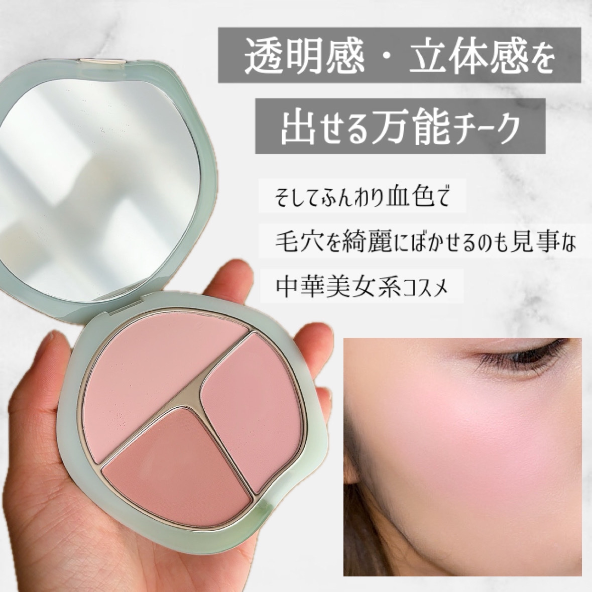 - 「膨張色+メインカラー+収縮色」の三色一体型チークパレット。 異なる明度と彩度の色で自然なグラデーションと立体感を作ることが可能。単色で使用すれば様々な雰囲気のメイクが楽しめ、違う色を重ねて使用すると、三色が程よいバランスで雰囲気と立体感を作り出す。