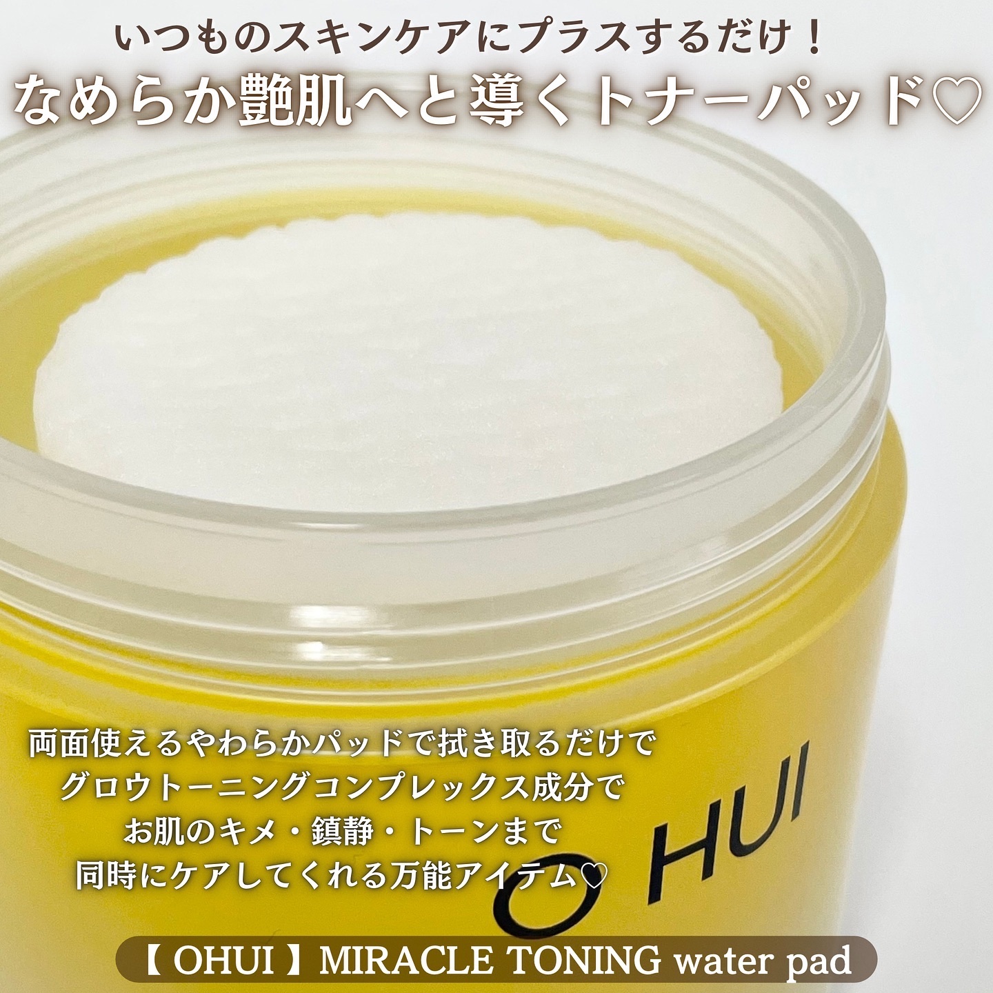 OHUIの人気ライン"ミラクルトーニング"のトナーパッド💛 エンボスパターン面は、柔らかく吸い取って肌のキメをなめらかに整えてくれるそう📝 みずみずしく爽やかな使い心地💎 ベタつきもないので、朝のメイク前の使用にもおすすめ🌸