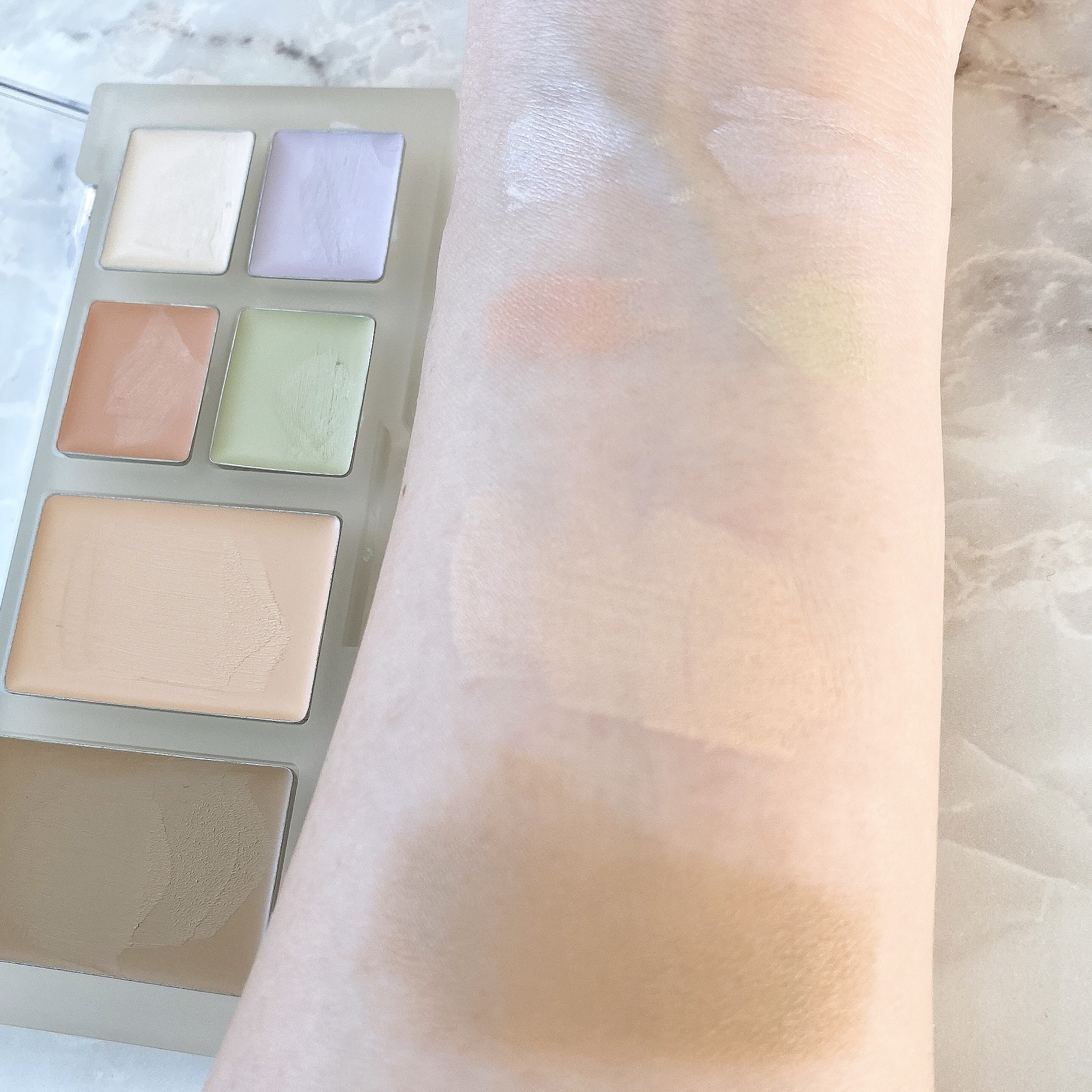 - 6色のカラーが入った、コンシーラーパレットで、コンシーラーとしてだけでなく、シェーディング、ハイライト、トーン調整が可能です。 ピーチ: クマカバーにおすすめ。保湿力が高く、ナチュラルなツヤ感です。 グリーン:ニキビや赤みのカバーにおすすめ。滑らかなテクスチャーで、カバー力が高いです。 パープル: くすみカバーにおすすめ。保湿力が高く、ナチュラルなツヤ感です。 ハイライト: 光の屈折を利用し、自然で柔らかい輝きを与えます。 シェーディング: 自然に影を演出し、しっかりと密着します。 コンシーラー: 滑らかなテクスチャーで、カバー力が高いです。