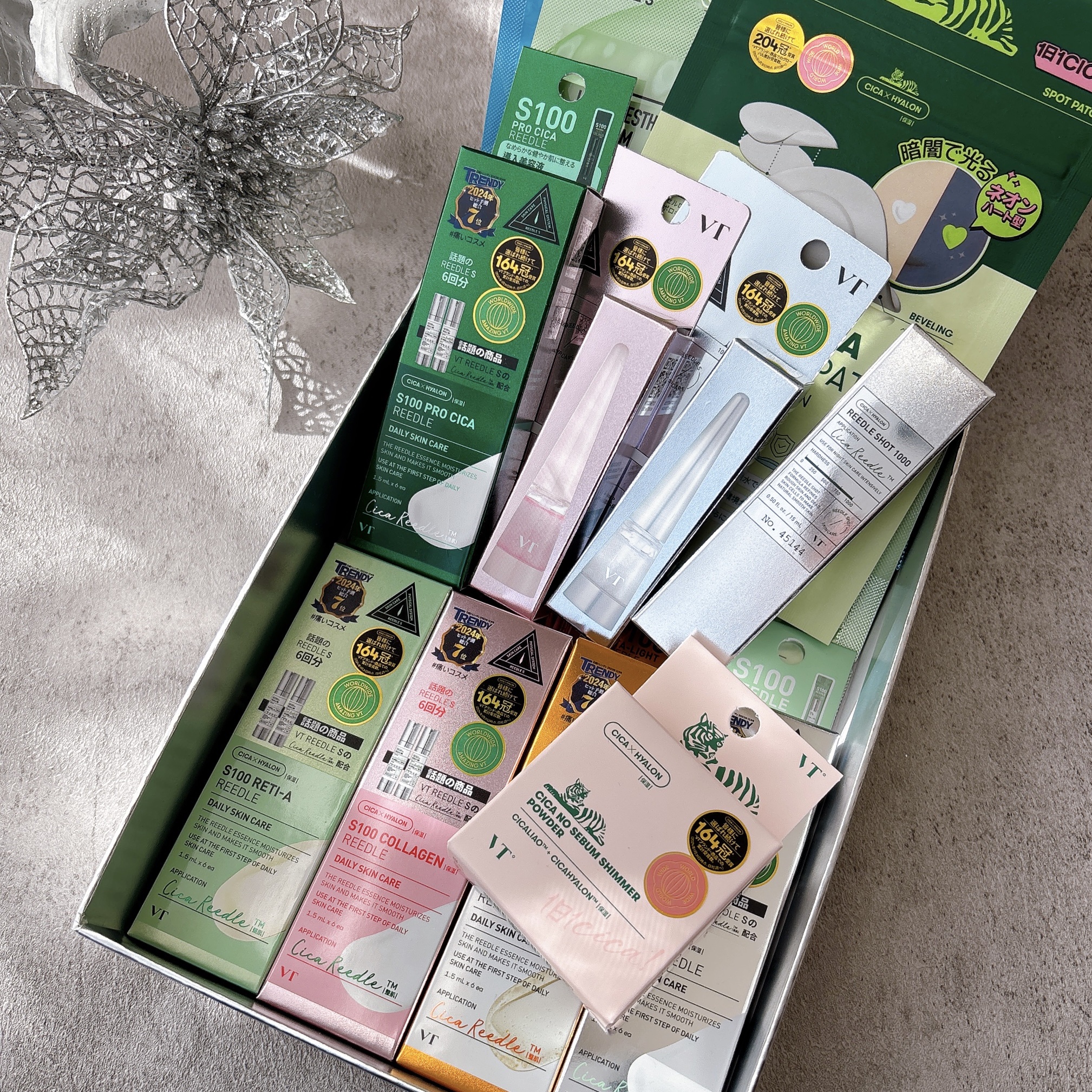 めちゃ豪華だよ〜🎁😍 VT HOLIDAY SET🎄💫 人気商品が勢揃い✨ おうちでエステ級のケアが叶うパック✨ リードルショットとセットになってるのがいいね♡ ほんのりピンク色のパウダーが細かくて 少しキラキラ肌馴染み良くて仕上がり綺麗♡