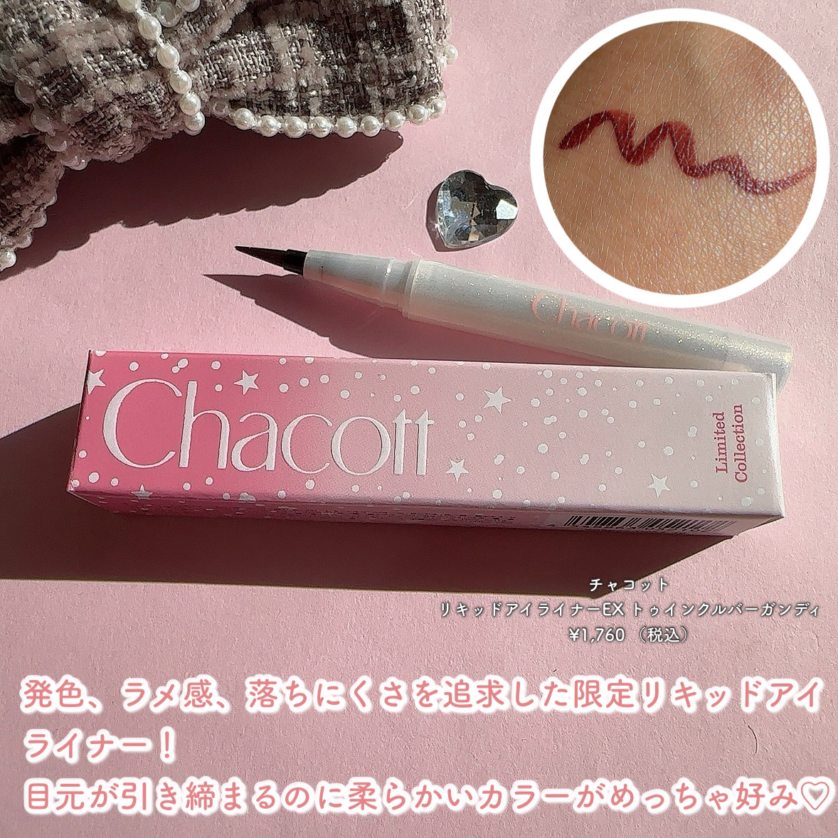 チャコットの冬期限定アイテムがかわいい🥺🎄.* 2024 WINTER LIMITED COLLECTION 🤍フェイスカラーパレットEX【516】煌めきに包まれた限定コレクション✩.*˚ アイブロウとしても使えるパレット🙌🏻 ピンクラメとブラウンの相性がいい!チークのピンクもかわいくて、お気に入り💗 発色、ラメ感、落ちにくさを追求したリキッドアイライナー。 ウォータープルーフ&スマッジプルーフ処方で摩擦に強い速乾タイプ。