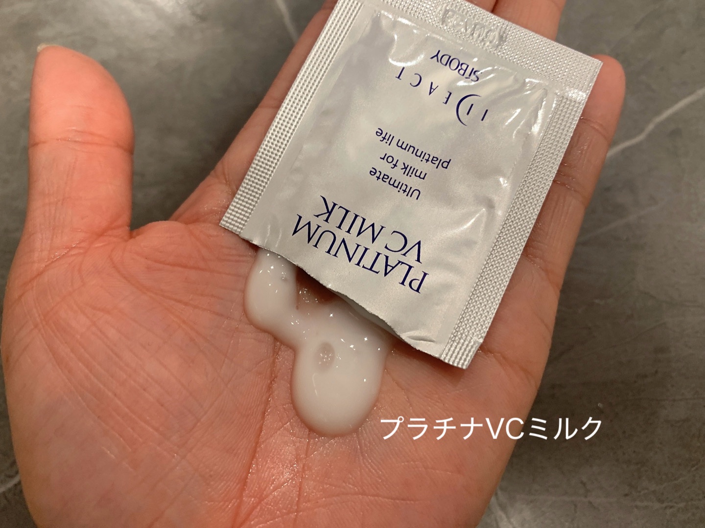 - ・プラチナVCローション 水、プロパンジオール、DPG、グリセリン、ペンチレングリコール、白金、プラセンタエキス、イソステアリルアスコルビルリン酸2Na、オリゴペプチド-34、ハイドロキノン、アルブチン、ビサボロール、トコフェリルリン酸Na、ダイズステロール、ラフィノース、プルーン分解物、アスコフィルムノドスムエキス、ヒメフウロエキス、セラミド1、セラミド2、セラミド3、セラミド5、セラミド6Ⅱ、コメヌカスフィンゴ糖脂質、ポリクオタニウム-51、リゾレシチン、水添レシチン、セタルコニウムクロリド、クエン酸Na、クエン酸、BG、フェノキシエタノール ・プラチナVCセラム 水、グリセリン、BG、白金、プラセンタエキス、イソステアリルアスコルビルリン酸2Na、パルミチン酸アスコルビルリン酸3Na、アスコルビルリン酸Na、α-アルブチン、オリゴペプチド-34、ヒアルロン酸Na、紅藻エキス、褐藻エキス、緑藻エキス、メリアアザジラクタ葉エキス、セイヨウオオバコ種子エキス、カミツレ花エキス、ニンファエアアルバ花エキス、オウゴンエキス、加水分解アルギン、ウンデシレノイルフェニルアラニン、レシチン、ダイズ油、1,2-ヘキサンジオール、システイニルプロアントシアニジンオリゴマー、水酸化Na、クエン酸Na、オレイン酸Na、アルギン酸Na、ポリ-γ-グルタミン酸Na、パルミトイルプロリンNa、ポリアクリル酸Na、キトサン、ナイアシンアミド、セテアリルグルコシド、ヒドロキシエチルセルロース、カラギーナン、PVP、DPG、EDTA、フェノキシエタノール ・プラチナVCミルク 水、グリセリン、DPG、トリエチルヘキサノイン、ペンチレングリコール、BG、ステアリン酸スクロース、水添ポリデセン、ステアリン酸ポリグリセリル-10、白金、プラセンタエキス、イソステアリルアスコルビルリン酸2Na、テトラヘキシルデカン酸アスコルビル、オリゴペプチド-34、ハイドロキノン、アルブチン、ビサボロール、アルギニン、ダイズ油、ダイズ種子エキス、ダイズステロール、ヒメフウロエキス、ナツメ果実エキス、カンゾウ根エキス、オウゴン根エキス、セラミド1、セラミド2、セラミド3、セラミド5、セラミド6Ⅱ、コメヌカスフィンゴ糖脂質、ポリクオタニウム-51、パルミチン酸セチル、リゾレシチン、レシチン、水添レシチン、クエン酸Na、水酸化Na、オレイン酸Na、アセチルヒアルロン酸Na、セタルコニウムクロリド、ベヘニルアルコール、ステアリン酸グリセリル、カルボマー、キサンタンガム、EDTA、フェノキシエタノール