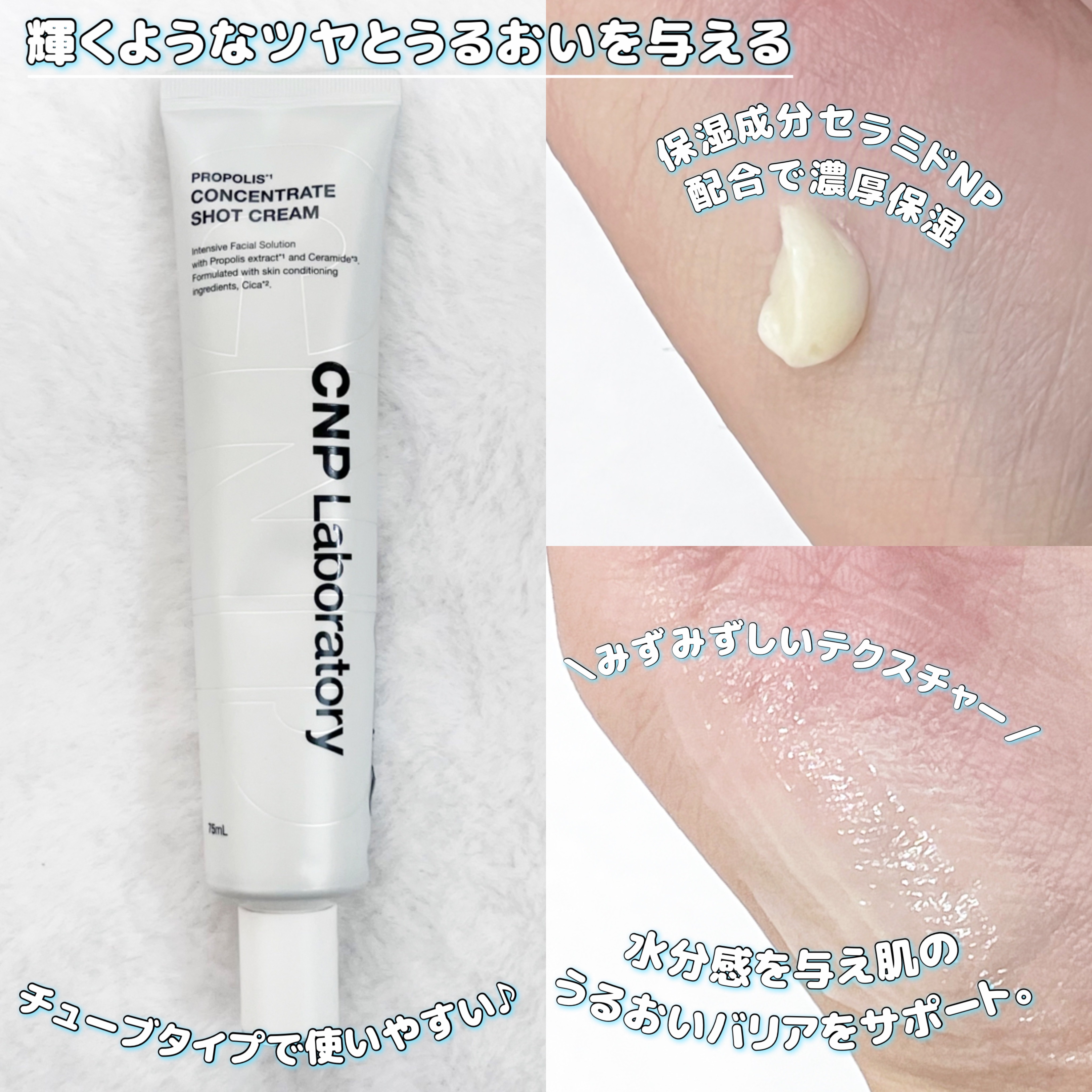 うるおい密封!保湿チャージ ! ハリ感のあるツヤ美肌へ導く濃密クリーム CNPこだわりのプロポリスエキスの配合量を従来品より 1.5倍に増量し、チューブタイプに! なめらかでこっくりとしたテクスチャーのクリーム 重たいかなと思ったけど塗り広げるとすーっと伸びて、肌をしっとり保湿をしてくれるような使用感!