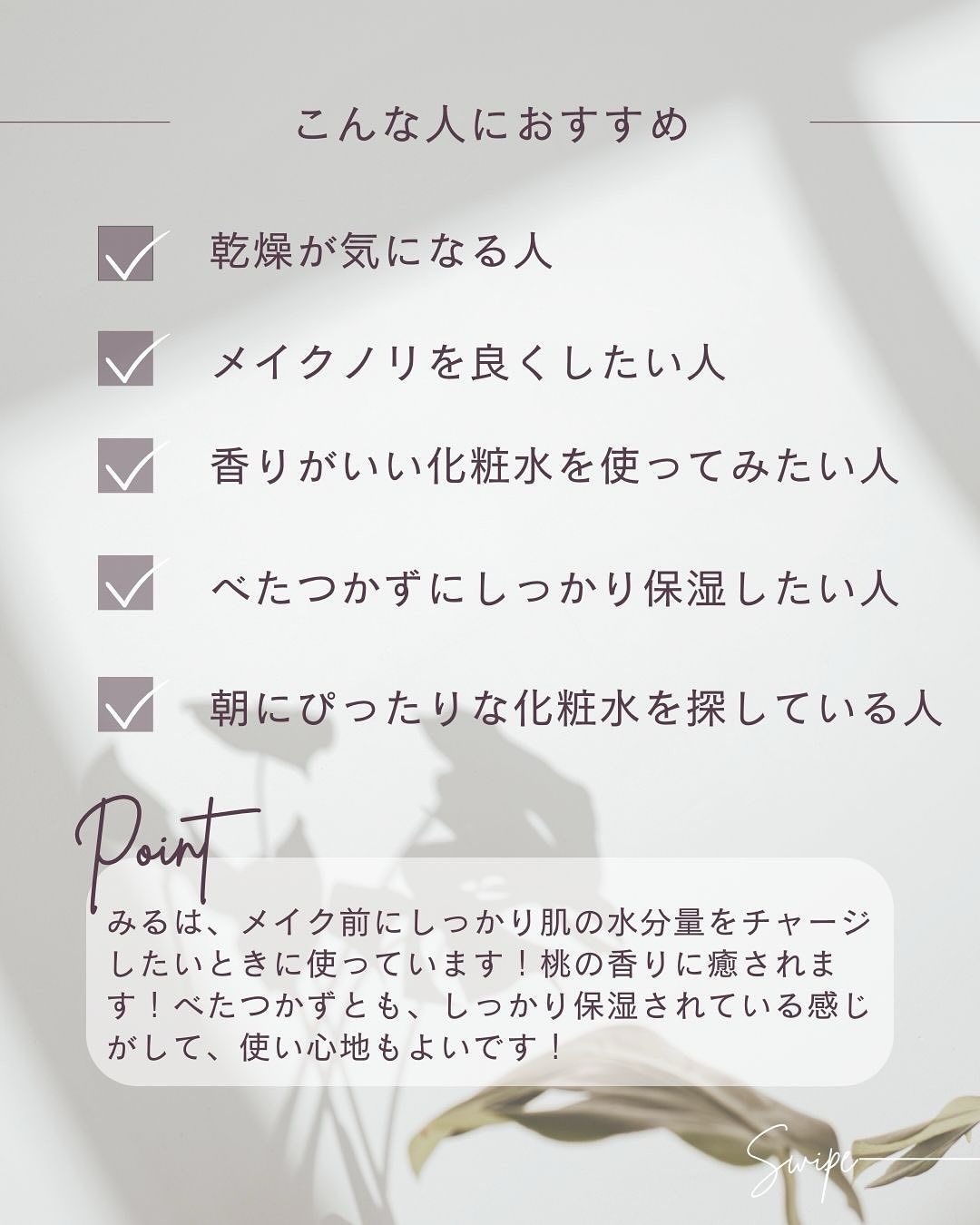 | 化粧水ランキング第37位 | ほんの気持ちとろみのあるテクスチャー。 なんかまろやかな感じ。でもサラッとしてます! | 詳細を見る |