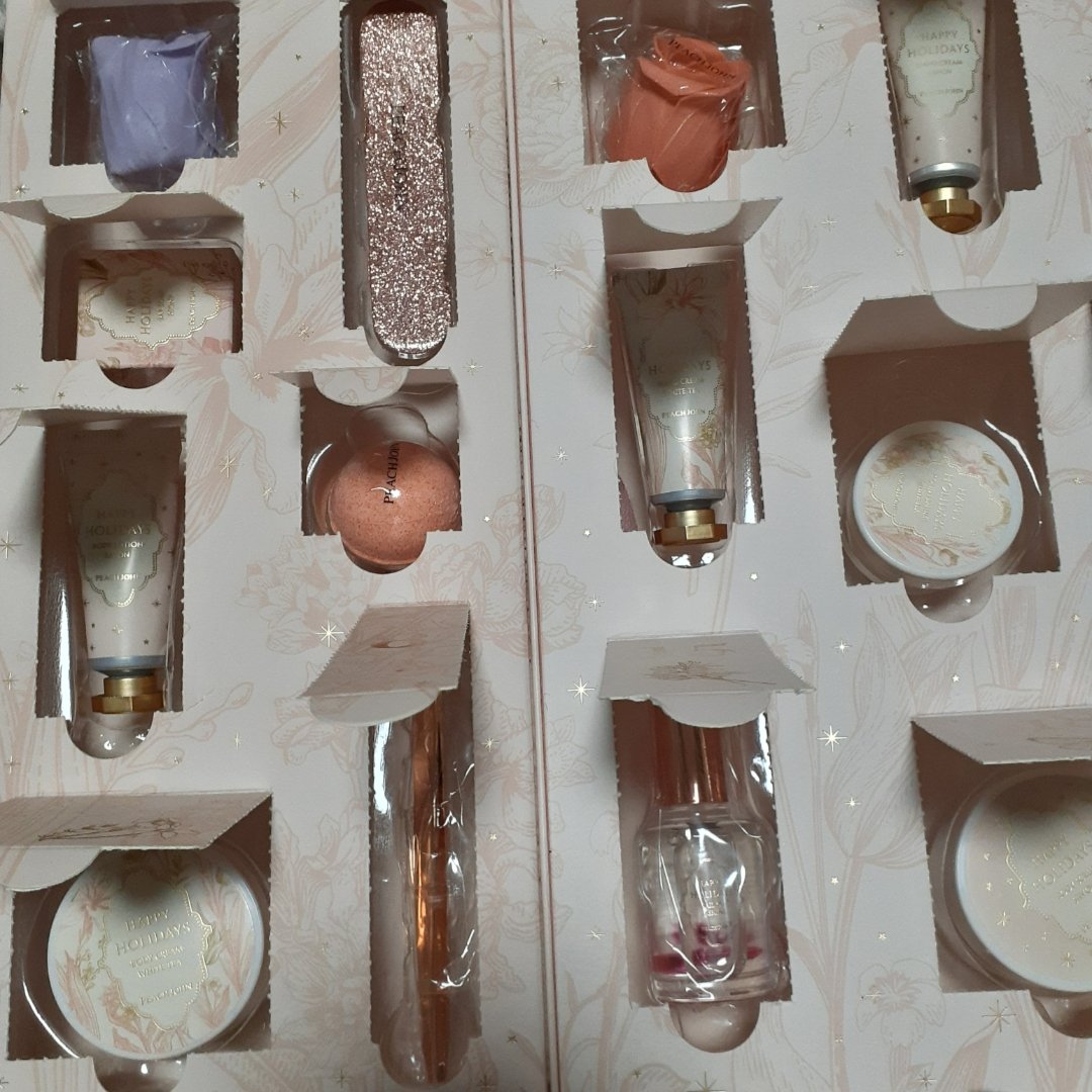 ピーチジョンから今年初めてのアドベントカレンダーが!! すっごく気になっていて再入荷を何度も待ちついにゲットできました♥ バスペタルは泡風呂でも花びらを浮かべても○石鹸やバスボールも入っていてバスタイムが華やぎそうねすね! 全体的にピンクでとにかく可愛いです♥ 香りはホワイトティー、ピオニー、サボン、ジャスミンの4種でどれも素敵です。