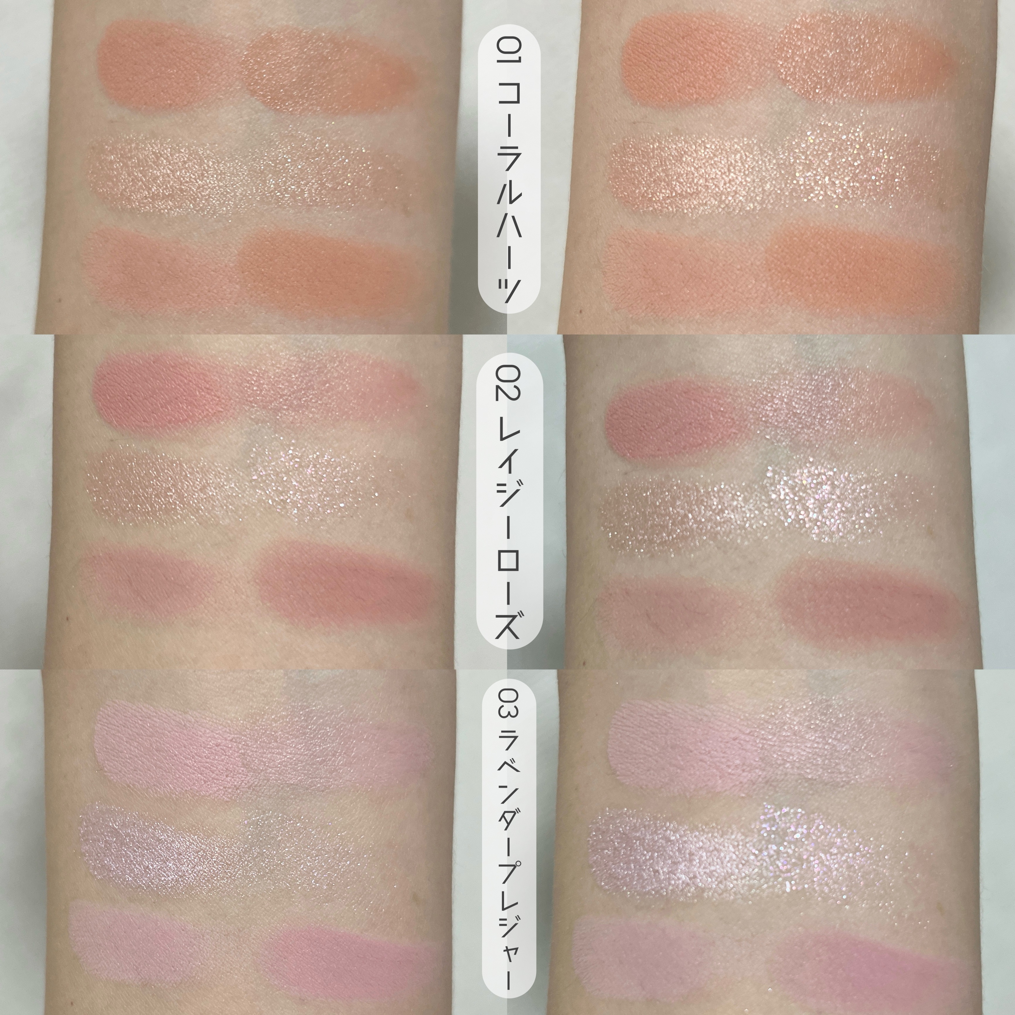 - <04 ピーチフラッシュ> 1Sweet ジメチコン、合成フルオロフロゴパイト、マイカ、酸化チタン、ジフェニルシロキシフェニルトリメチコン、ポリプロピレン、ポリメチルシルセスキオキサン、リンゴ酸ジイソステアリル、炭酸ジカプリリル、ホウケイ酸(Ca/チタン)、ヘキサ(ヒドロキシステアリン酸/ステアリン酸/ロジン酸)ジペンタエリスリチル、(ジメチコン/ビニルジメチコン)クロスポリマー、ステアロイルオキシステアリン酸オクチルドデシル、タルク、ポリイソブテン、1,2-ヘキサンジオール、水添レシチン、酸化スズ、カプリル酸グリセリル、シリカ、酸化鉄、トリエトキシカプリリルシラン、トコフェロール 2Fairy ジメチコン、マイカ、タルク、酸化チタン、ジフェニルシロキシフェニルトリメチコン、ステアリン酸Mg、(ジメチコン/ビニルジメチコン)クロスポリマー、リンゴ酸ジイソステアリル、水添ポリ(C6-14オレフィン)、酸化鉄、ポリプロピレン、水添レシチン、シリカ、カルミン、1,2-ヘキサンジオール、トリエトキシカプリリルシラン、マンガンバイオレット、カプリル酸グリセリル、ラウロイルリシン、水酸化Al、マルトデキストリン、カオリン 3Brown タルク、マイカ、酸化鉄、グンジョウ、窒化ホウ素、シリカ、(ビニルジメチコン/メチコンシルセスキオキサン)クロスポリマー、エチルヘキサン酸セチル、ステアリン酸Mg、トリ(カプリル酸/カプリン酸)グリセリル、ヘキサ(ヒドロキシステアリン酸/ステアリン酸/ロジン酸)ジペンタエリスリチル、マンガンバイオレット、カルミン、カオリン、1,2-ヘキサンジオール、ジメチコン、トリエトキシカプリリルシラン、水添レシチン、カプリル酸グリセリル、マルトデキストリン 4Candy ジメチコン、マイカ、酸化チタン、合成フルオロフロゴパイト、ジフェニルシロキシフェニルトリメチコン、ポリプロピレン、ポリメチルシルセスキオキサン、リンゴ酸ジイソステアリル、炭酸ジカプリリル、ヘキサ(ヒドロキシステアリン酸/ステアリン酸/ロジン酸)ジペンタエリスリチル、タルク、(ジメチコン/ビニルジメチコン)クロスポリマー、ステアロイルオキシステアリン酸オクチルドデシル、ポリイソブテン、カルミン、黄4、1,2-ヘキサンジオール、水添レシチン、酸化鉄、カプリル酸グリセリル、シリカ、酸化スズ、トリエトキシカプリリルシラン、マルトデキストリン、トコフェロール 5Peach ジメチコン、マイカ、タルク、ジフェニルシロキシフェニルトリメチコン、ステアリン酸Mg、酸化チタン、(ジメチコン/ビニルジメチコン)クロスポリマー、黄4、リンゴ酸ジイソステアリル、カルミン、水添ポリ(C6-14オレフィン)、酸化鉄、ポリプロピレン、水添レシチン、シリカ、1,2-ヘキサンジオール、トリエトキシカプリリルシラン、カプリル酸グリセリル、マルトデキストリン 6Mellow オクチルドデカノール、イソノナン酸イソノニル、トリイソステアリン酸ポリグリセリル-2、トリエチルヘキサノイン、テトライソステアリン酸ペンタエリスリチル、水添ポリイソブテン、酸化チタン、トリ(カプリル酸/カプリン酸)グリセリル、ダイマージリノール酸(フィトステリル/イソステアリル/セチル/ステアリル/ベヘニル)、セレシン、シリカ、ビスジグリセリルポリアシルアジペート-2、マイカ、オゾケライト、合成ワックス、ステアラルコニウムヘクトライト、セスキオレイン酸ソルビタン、ポリリシノレイン酸ポリグリセリル-6、酸化鉄、カルミン、炭酸プロピレン、黄4、ポリヒドロキシステアリン酸、イソステアリン酸、パルミチン酸エチルヘキシル、ミリスチン酸イソプロピル、レシチン、ジメチコン、デヒドロ酢酸、ポリリシノレイン酸ポリグリセリル-3、マルトデキストリン <05 ピンクフレア> 1Bare ジメチコン、合成フルオロフロゴパイト、マイカ、酸化チタン、ジフェニルシロキシフェニルトリメチコン、ポリプロピレン、タルク、ポリメチルシルセスキオキサン、リンゴ酸ジイソステアリル、炭酸ジカプリリル、ヘキサ(ヒドロキシステアリン酸/ステアリン酸/ロジン酸)ジペンタエリスリチル、(ジメチコン/ビニルジメチコン)クロスポリマー、ステアロイルオキシステアリン酸オクチルドデシル、ポリイソブテン、1,2-ヘキサンジオール、水添レシチン、酸化スズ、カプリル酸グリセリル、カルミン、シリカ、トリエトキシカプリリルシラン、酸化鉄、グンジョウ、マルトデキストリン、トコフェロール 2Blossom ジメチコン、マイカ、タルク、ジフェニルシロキシフェニルトリメチコン、ステアリン酸Mg、酸化チタン、(ジメチコン/ビニルジメチコン)クロスポリマー、リンゴ酸ジイソステアリル、水添ポリ(C6-14オレフィン)、ポリプロピレン、カルミン、水添レシチン、シリカ、グンジョウ、1,2-ヘキサンジオール、トリエトキシカプリリルシラン、酸化鉄、マンガンバイオレット、カプリル酸グリセリル、マルトデキストリン、カオリン 3Vintage タルク、マイカ、マンガンバイオレット、酸化鉄、窒