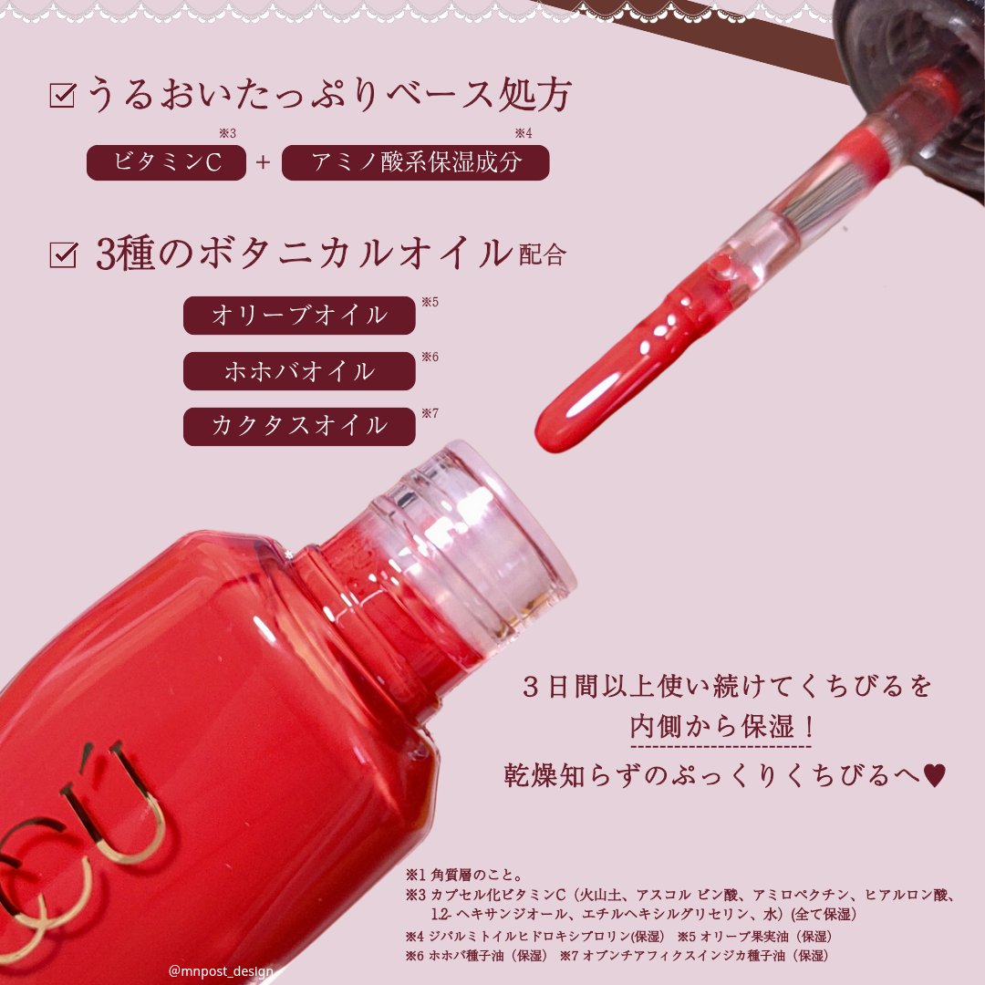 高級感のあるおしゃれで可愛いパッケージで可愛いだけじゃなく実力派…! 3日間以上使い続けることでくちびるが内側*から保湿されて”ぷっくり”するんだって❤️ ベタつかずにサラッとしたテクスチャーでぷるんとしたくちびるに仕上がるよ✨
